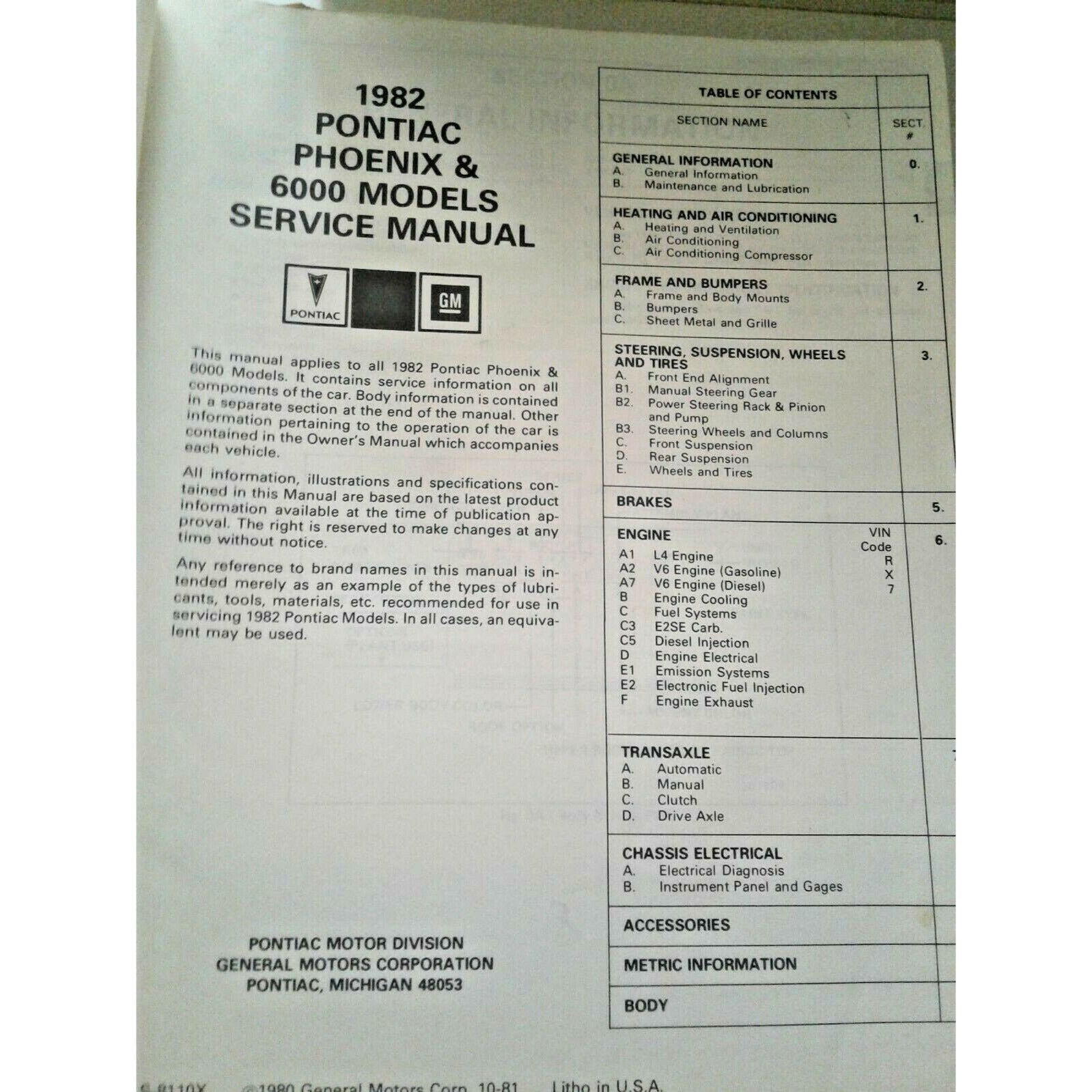 1982 Pontiac Service Manual Phoenix and 6000 Automobile Repair Shop