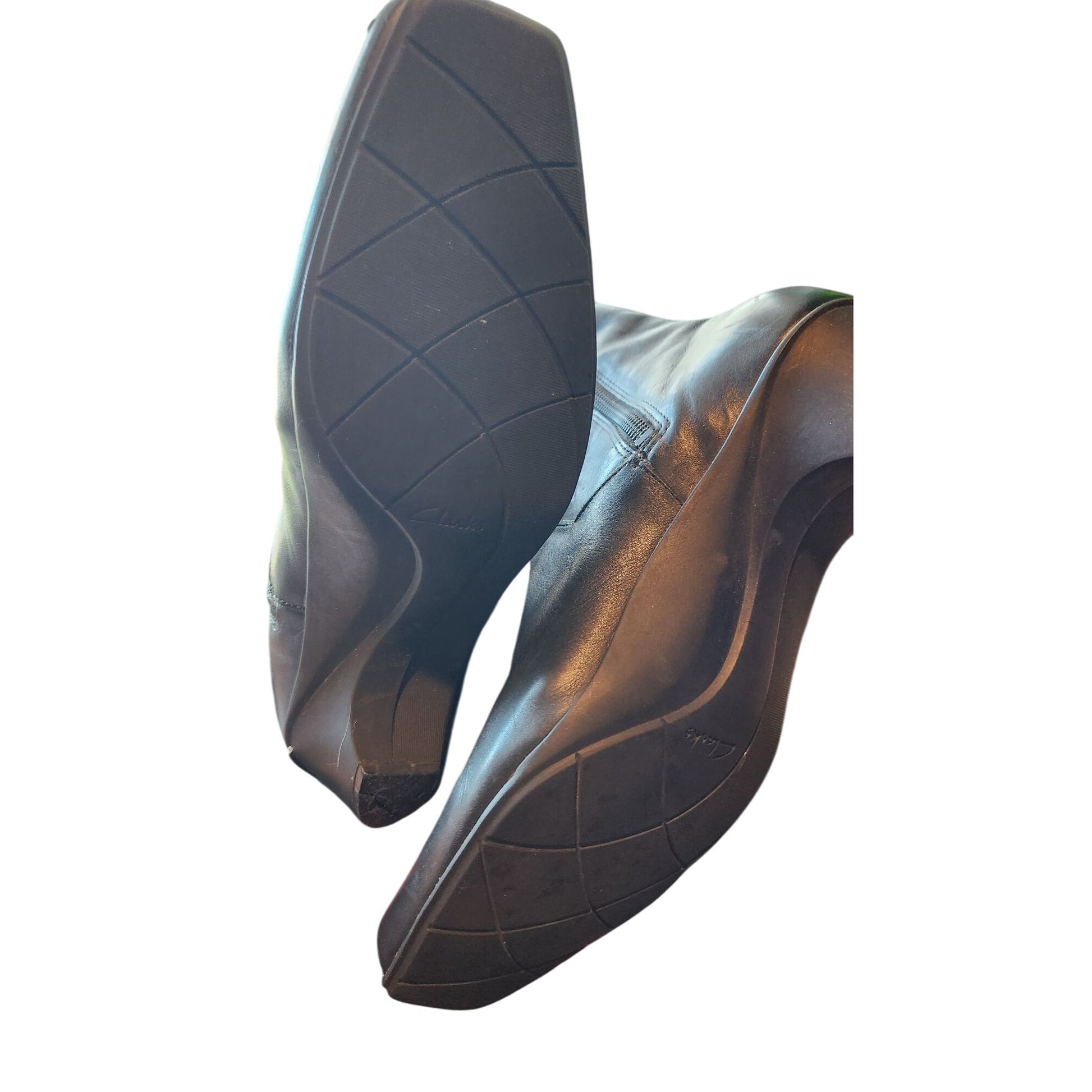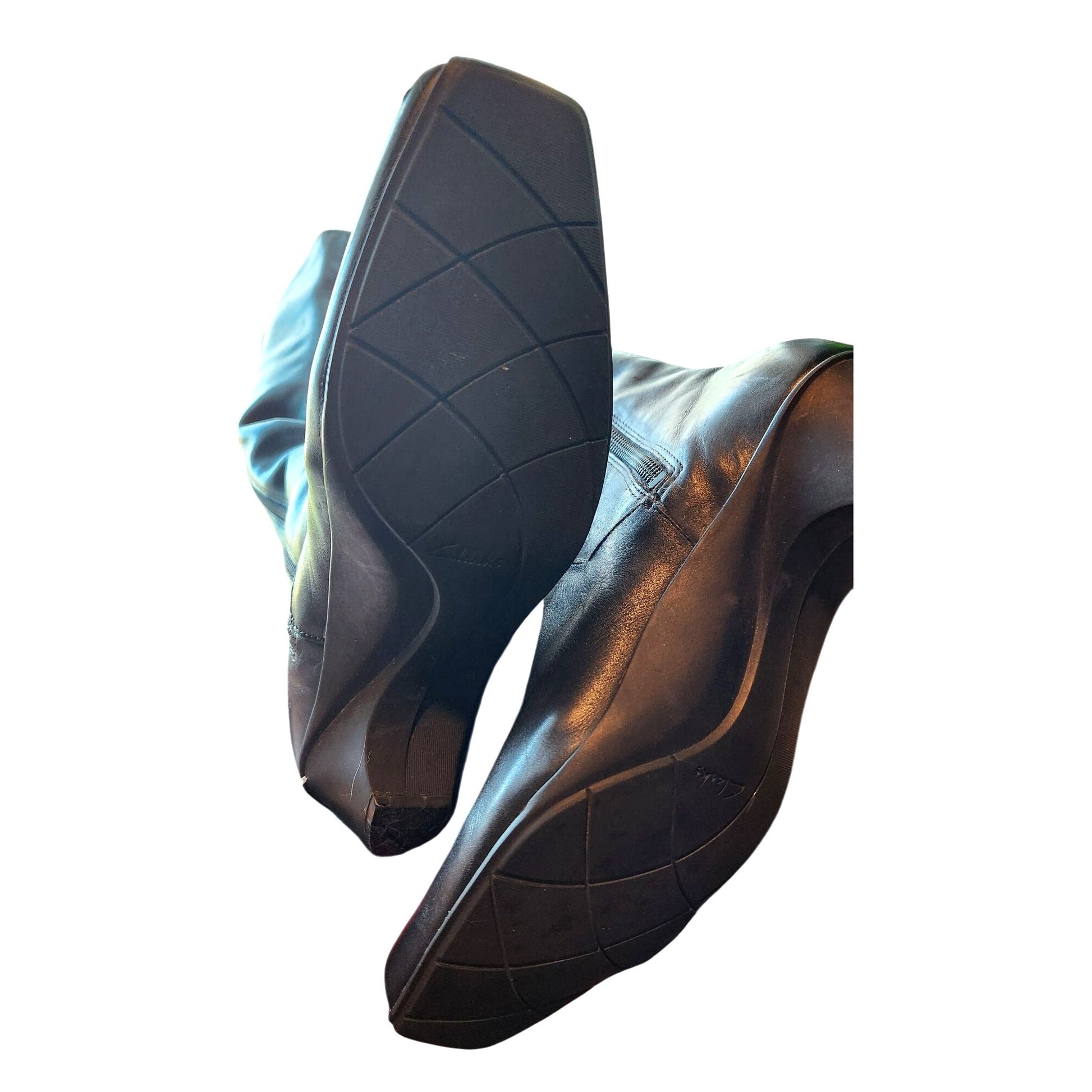 Vintage Clarks knee-high boots in black leather, featuring a 1-inch heel. Perfect for a classic look, though they do show signs of damage. Ideal for those who love a timeless style with character.