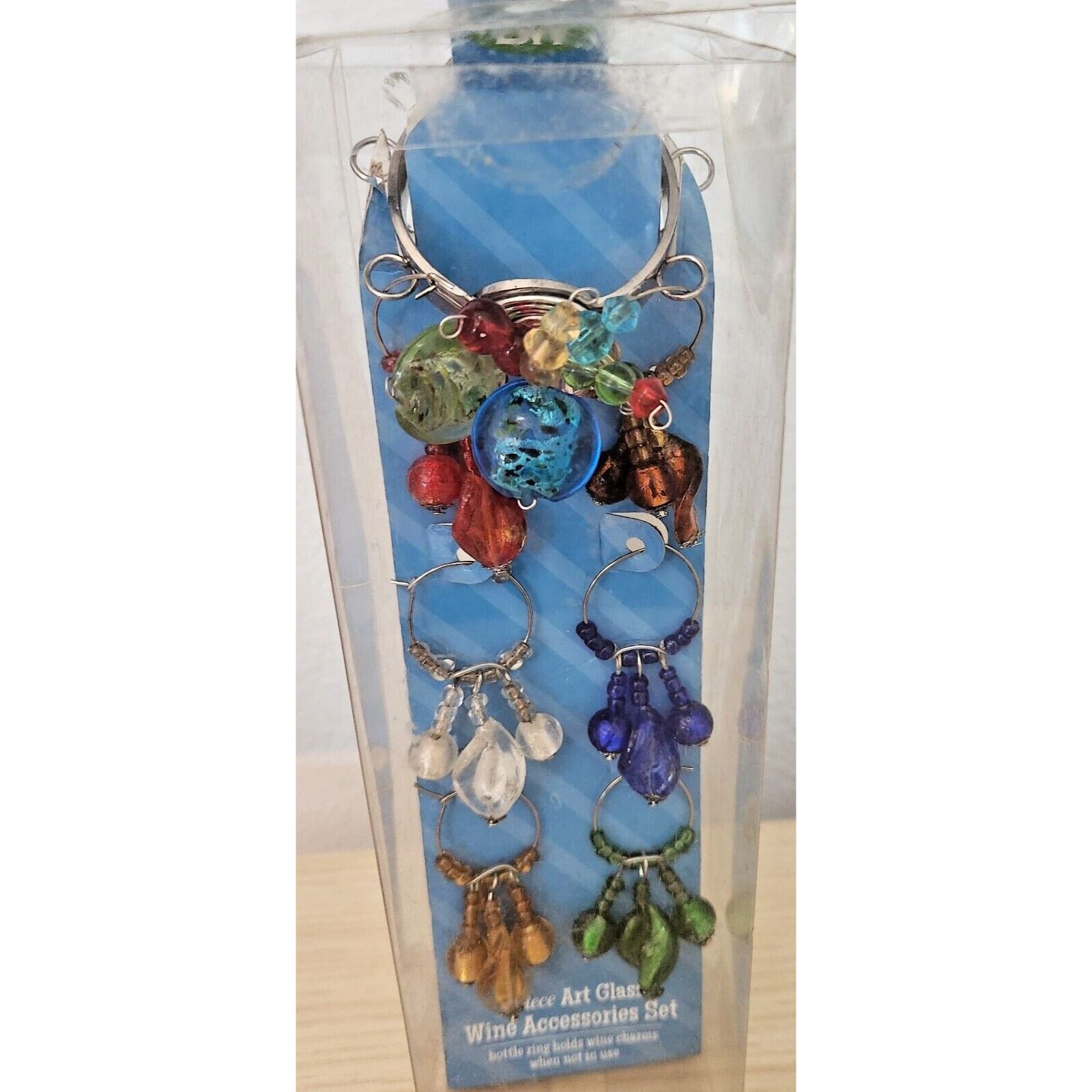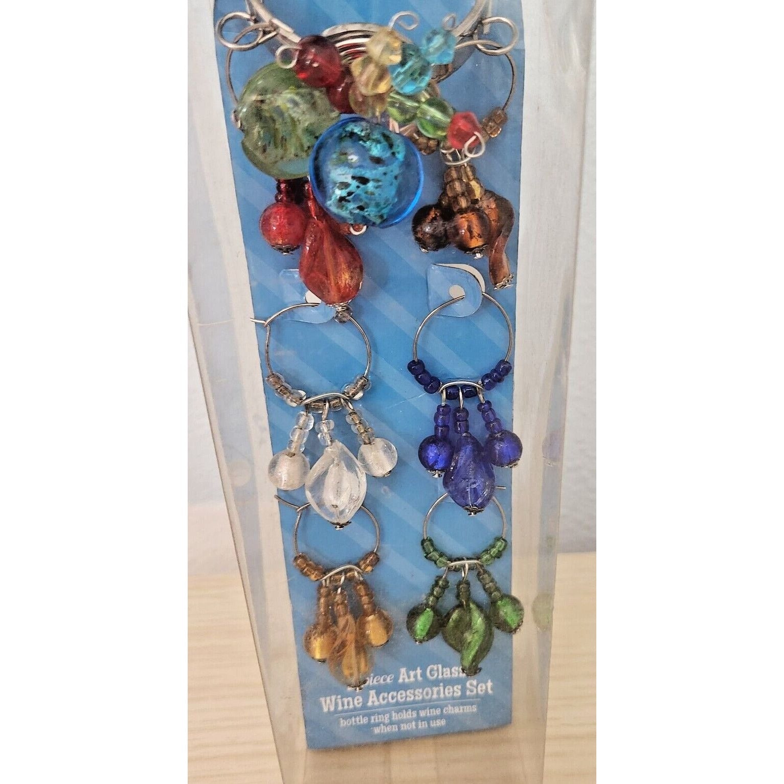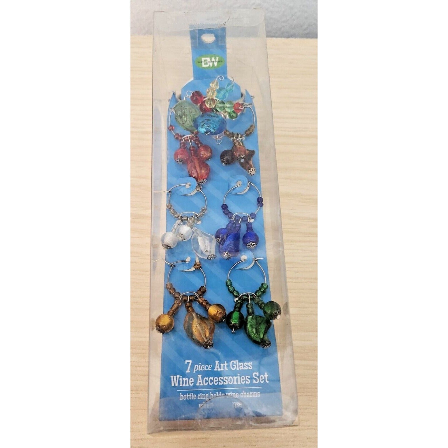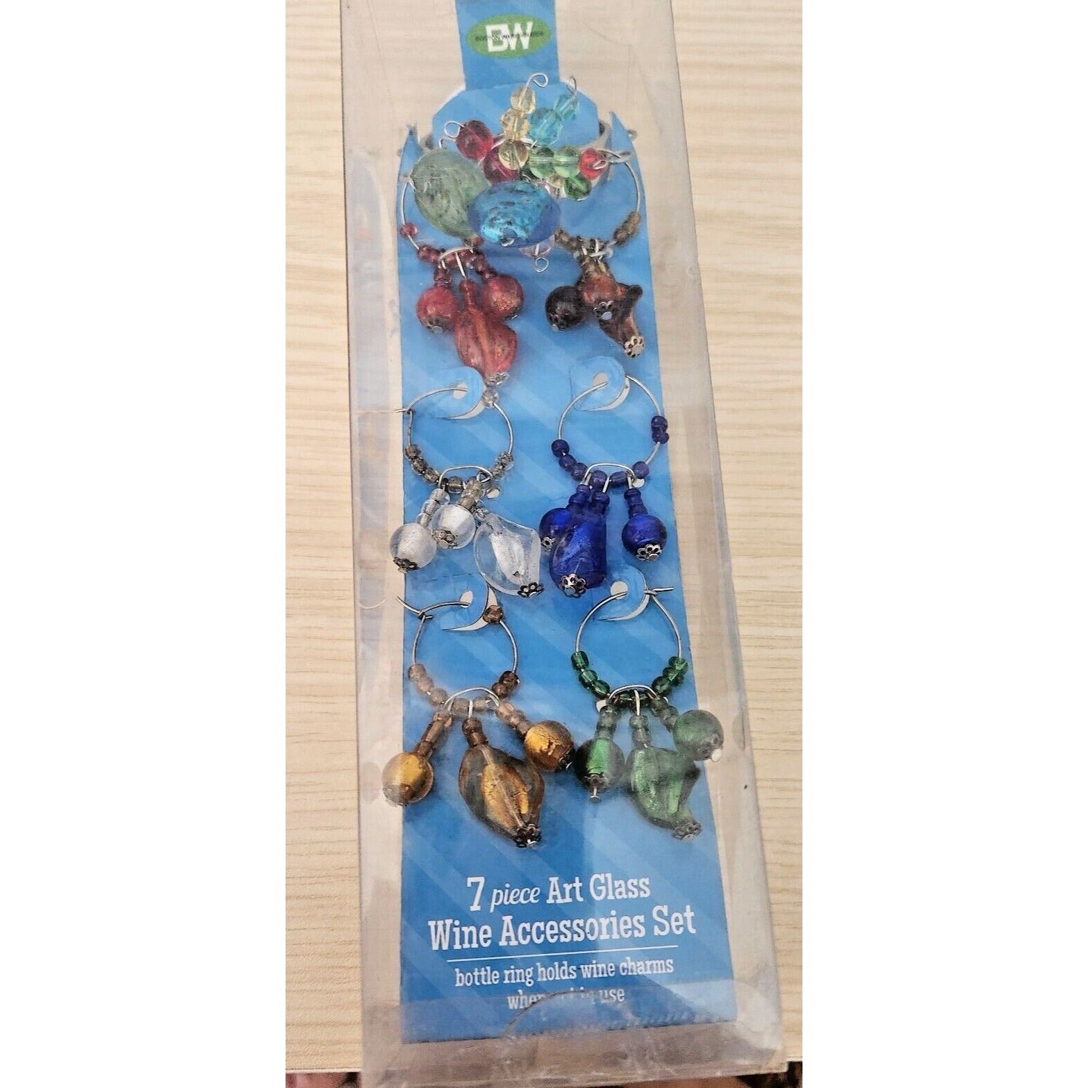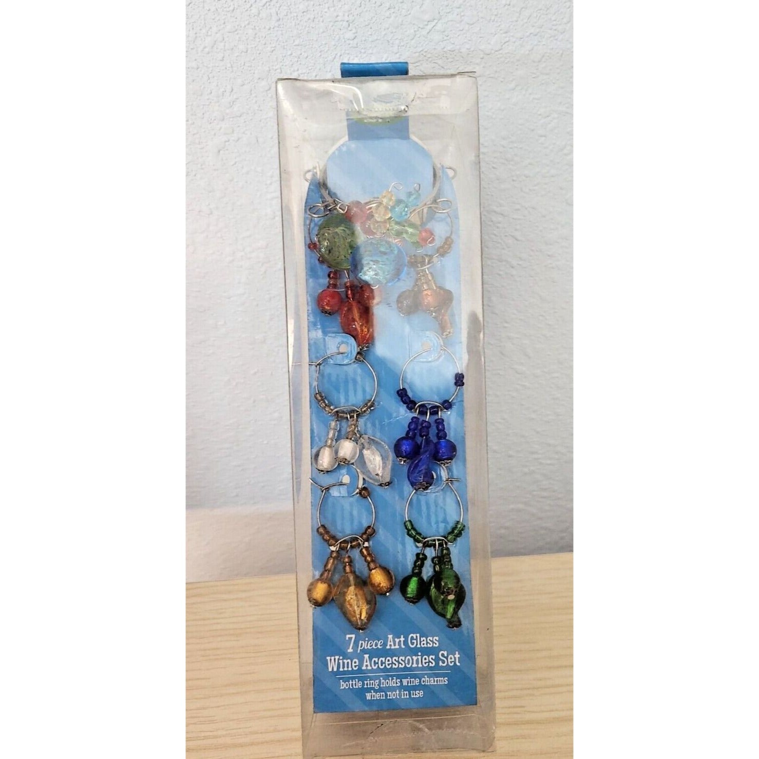 Boston Warehouse 7 Piece Art Glass 1 Wine Ring and 6 Beaded Wine Charms Drops