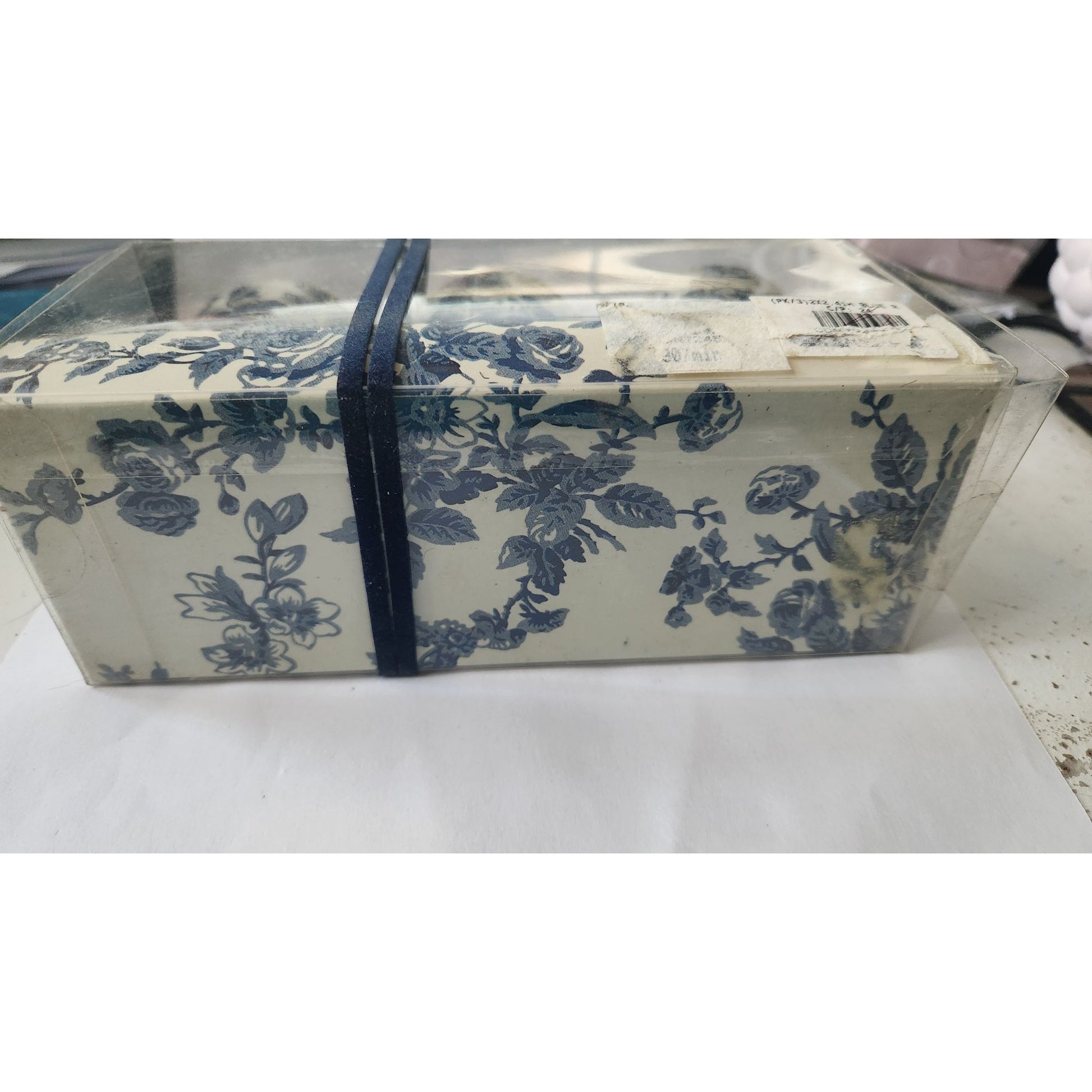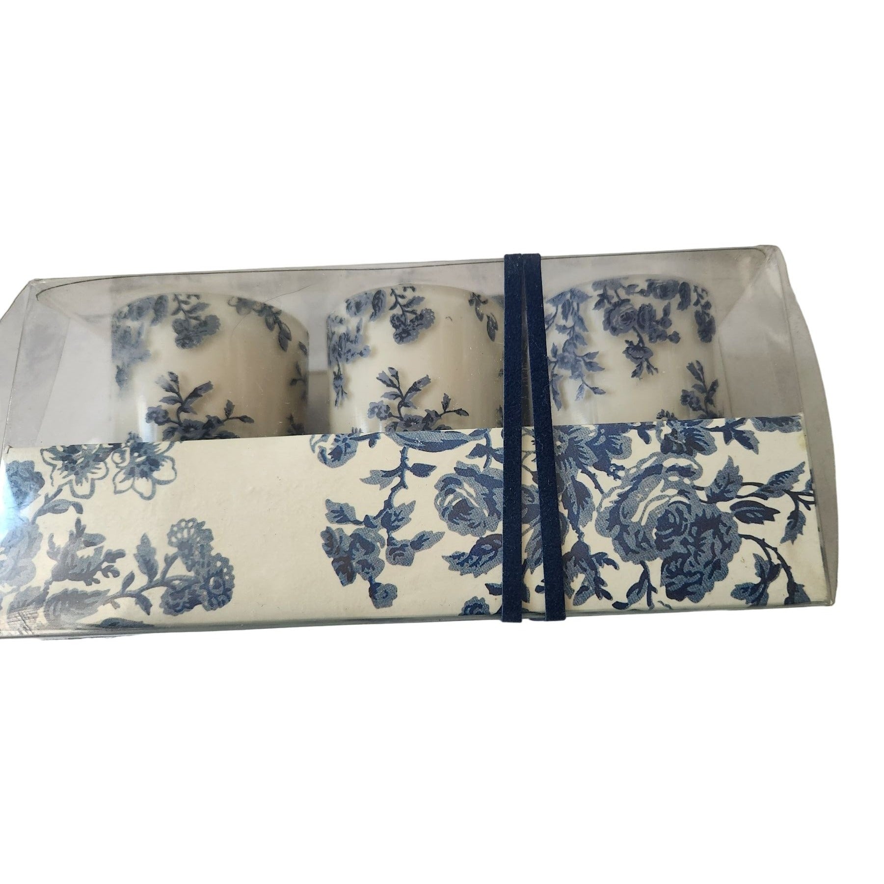 This LUXE set of 3 votive candles in blue floral design, each 2 1/2" tall and 2" top, adds a white sparkle to any setting. Comes in a gift box.