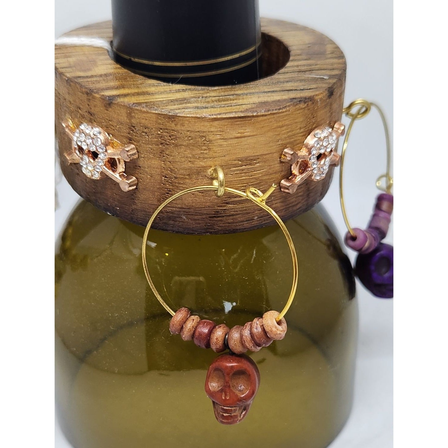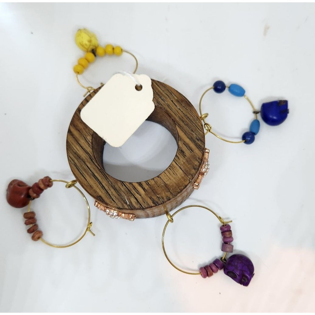 In a land where every sip of wine tells a tale, these vibrant skull-themed wine glass charms bring characters to life. A set of Four, each charm whispers its own story through colorful beads and distinct skull designs. Accompanied by a rustic wooden holder, they promise to enchant gatherings with tales of vibrant hues and lively spirits.