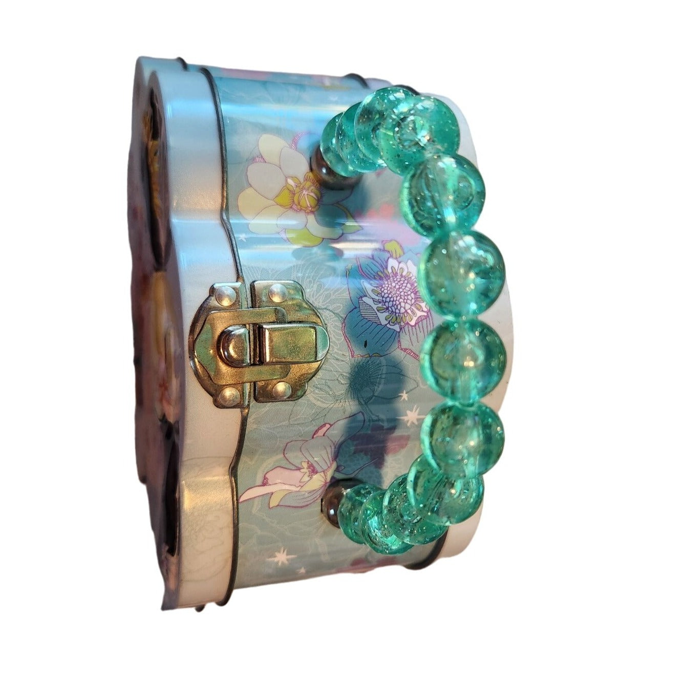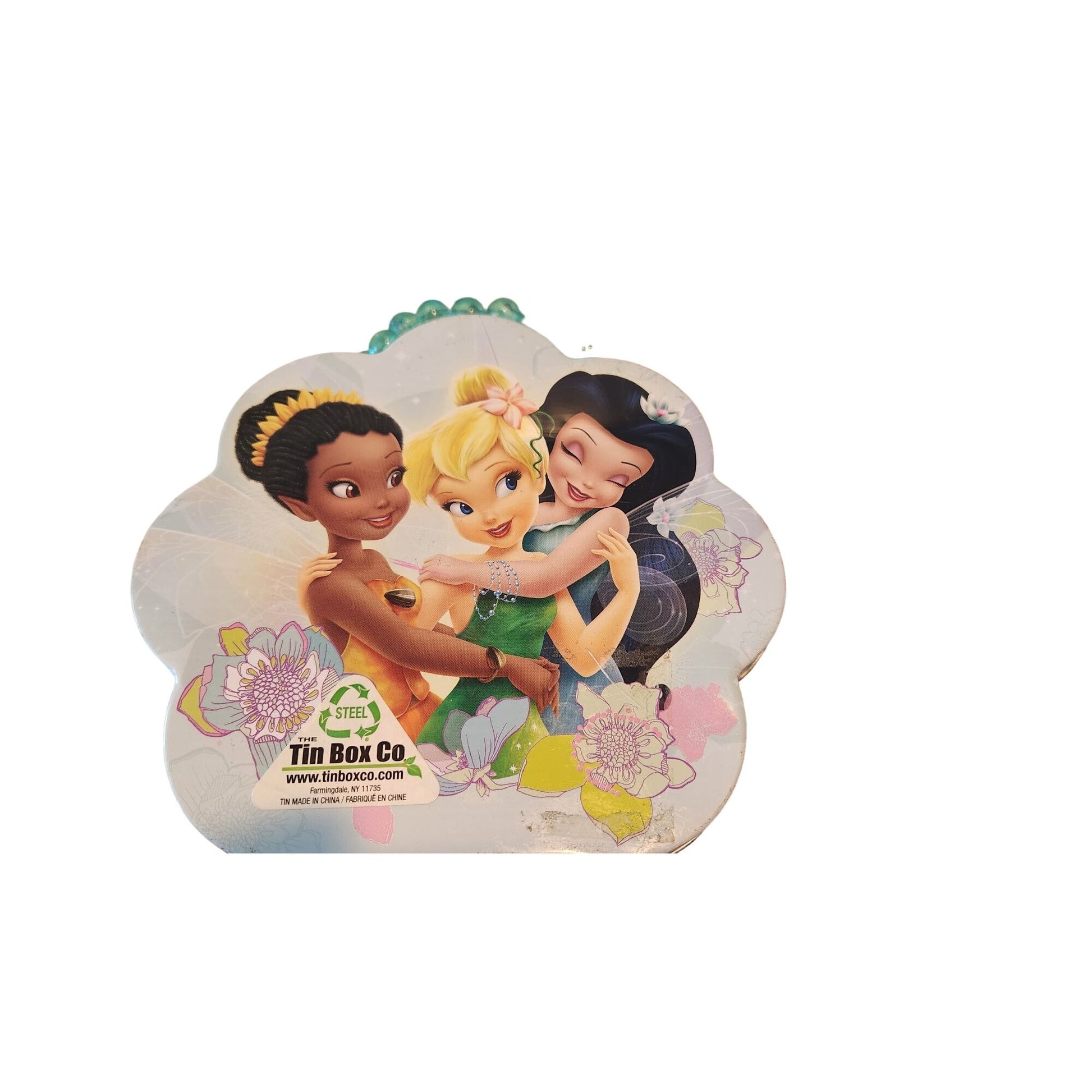 This Disney Mini Tin Box features Tinkerbell and her friends on a 6x6 1/2x3 box with a beaded handle. The inside is spotlessly clean, perfect for storing keepsakes.