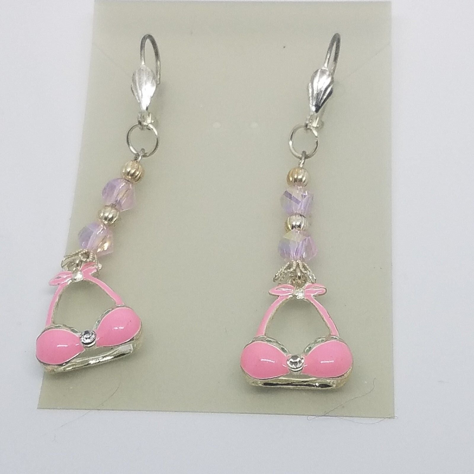Earrings Pink Bikini Bra Top 1/2 " Charm Silver Pink Beads Sterling Wire