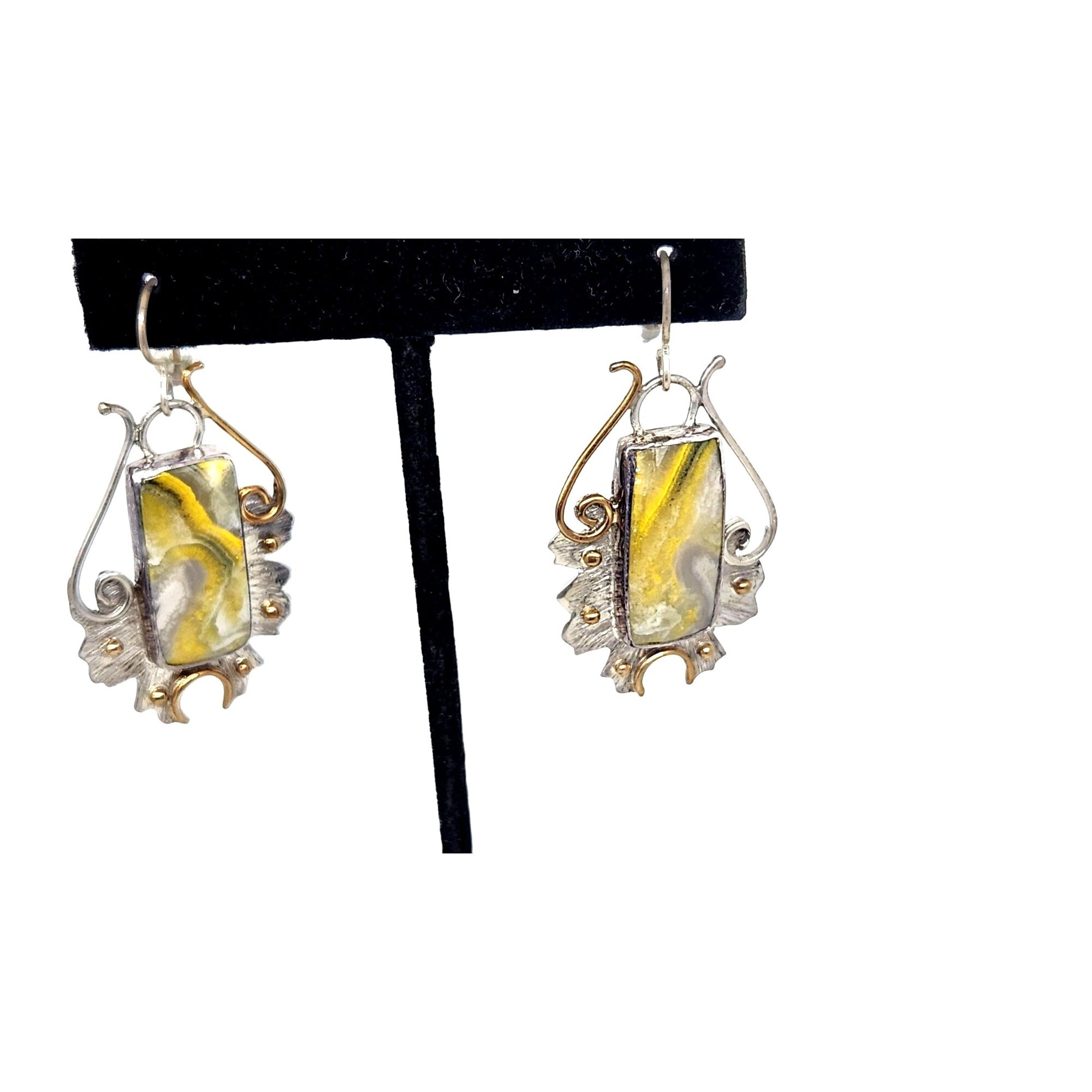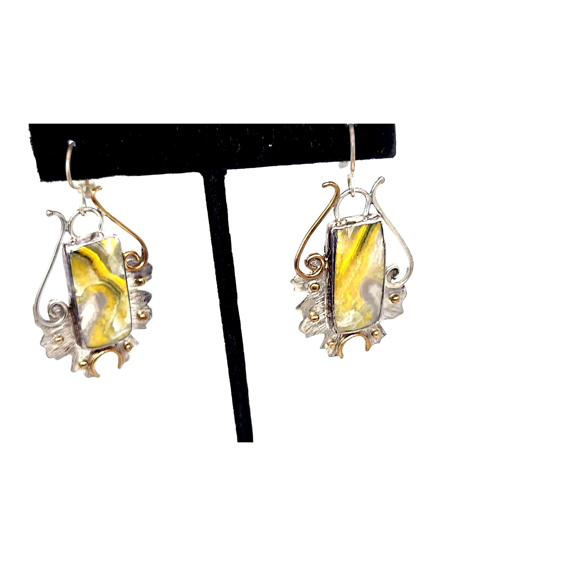 Earrings Bumble Bee Jasper 925 Silver 14K Gold 25mm x 10mm Silver Frame 40mm x 25mm Filigree Accents Top Hoop 20mm x 25