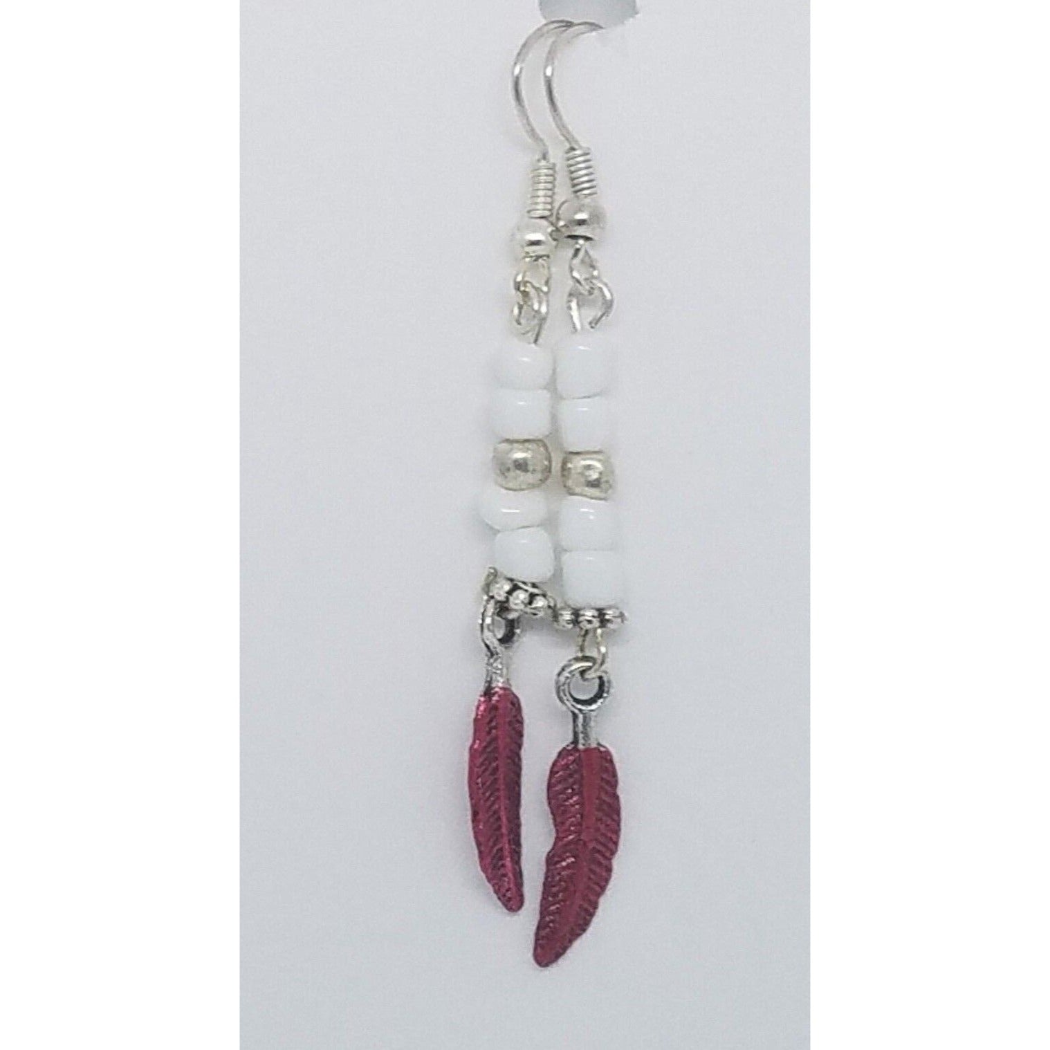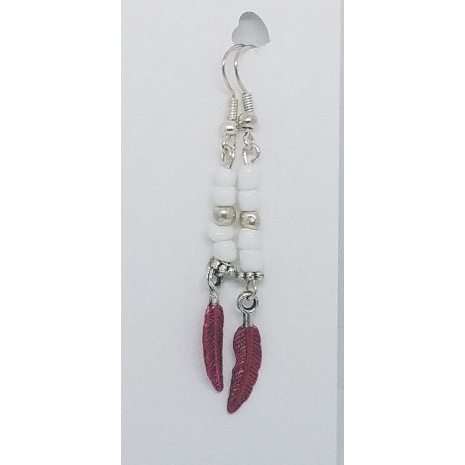 Earrings Small Painted Red Feather Charm Sterling Wire White & Silver Beads 2"