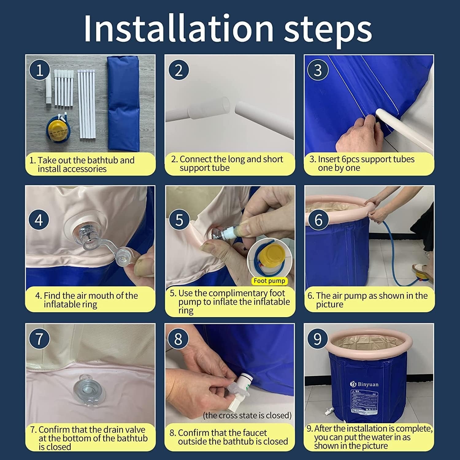 【Material thickening and insulation】- collapsible bathtub is made of PVC mesh fabric thickened material, waterproof and non-toxic. The water temperature can be maintained for 2 hours. The bathtub consists of six sturdy rods and an upper air ring, so your neck can lean on it when bathing, safe and comfortable.