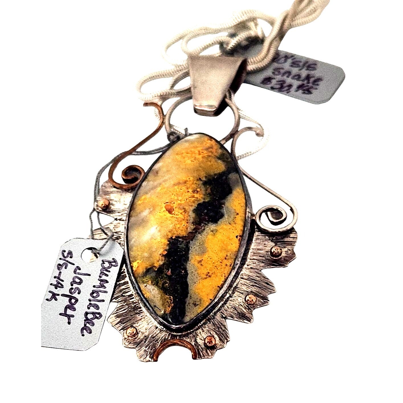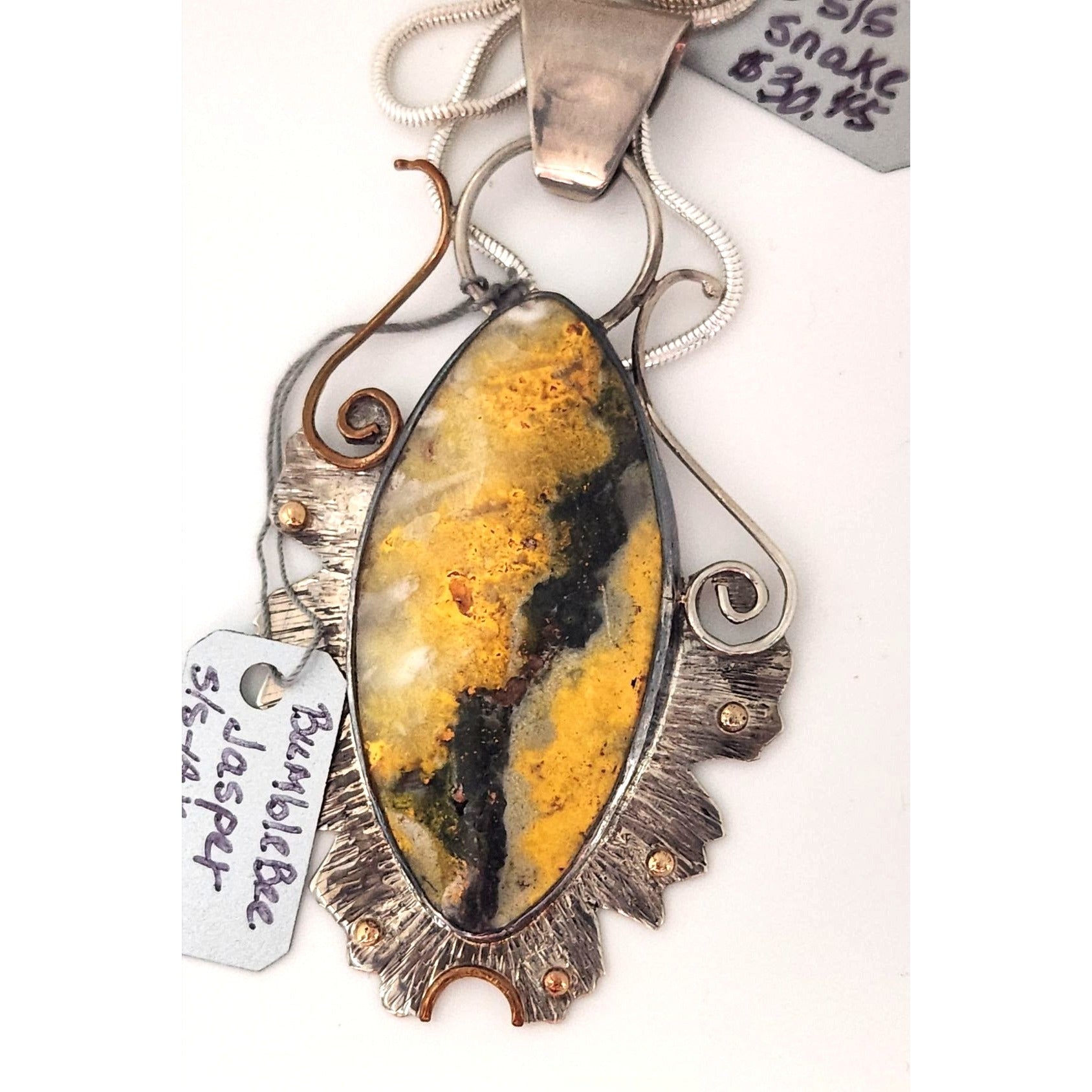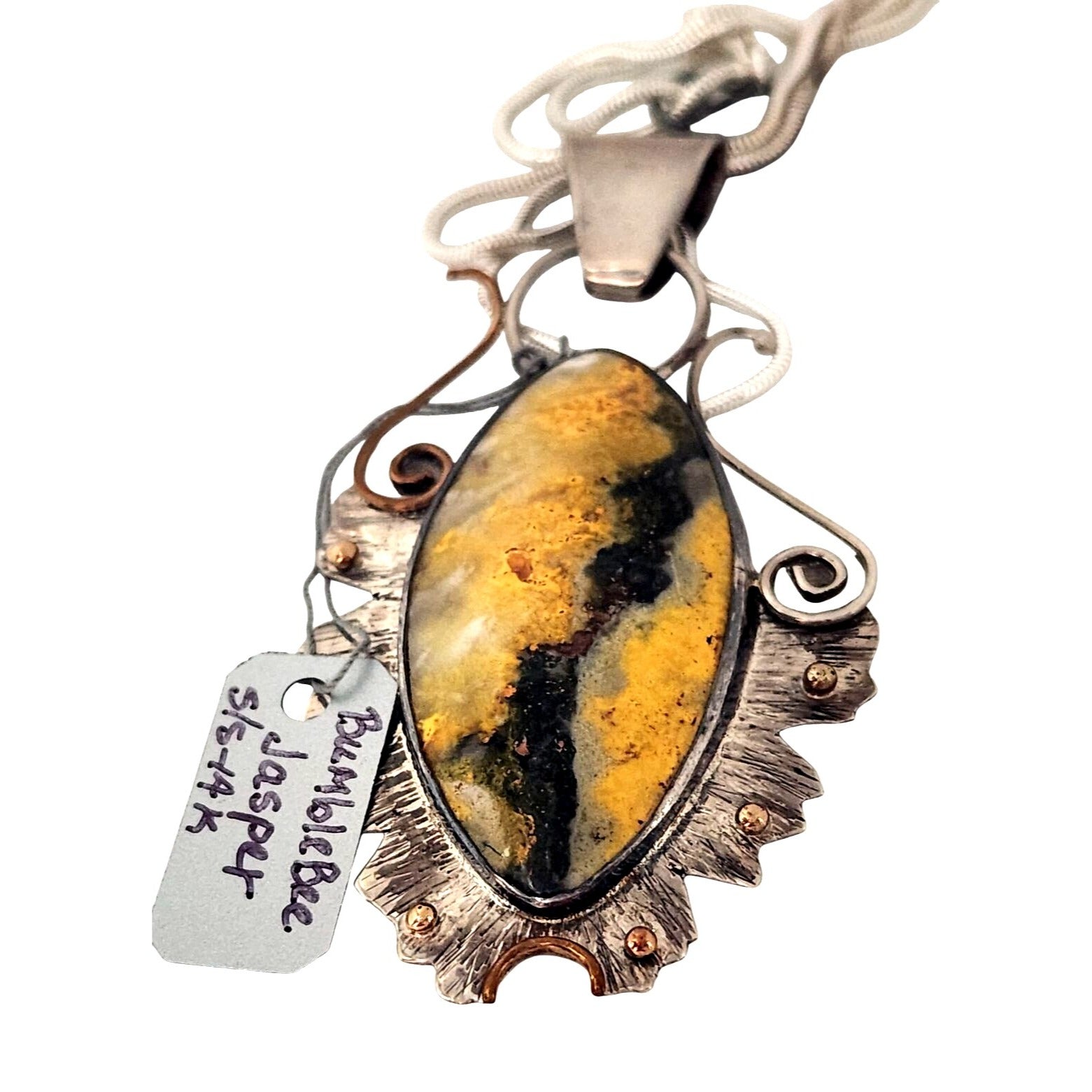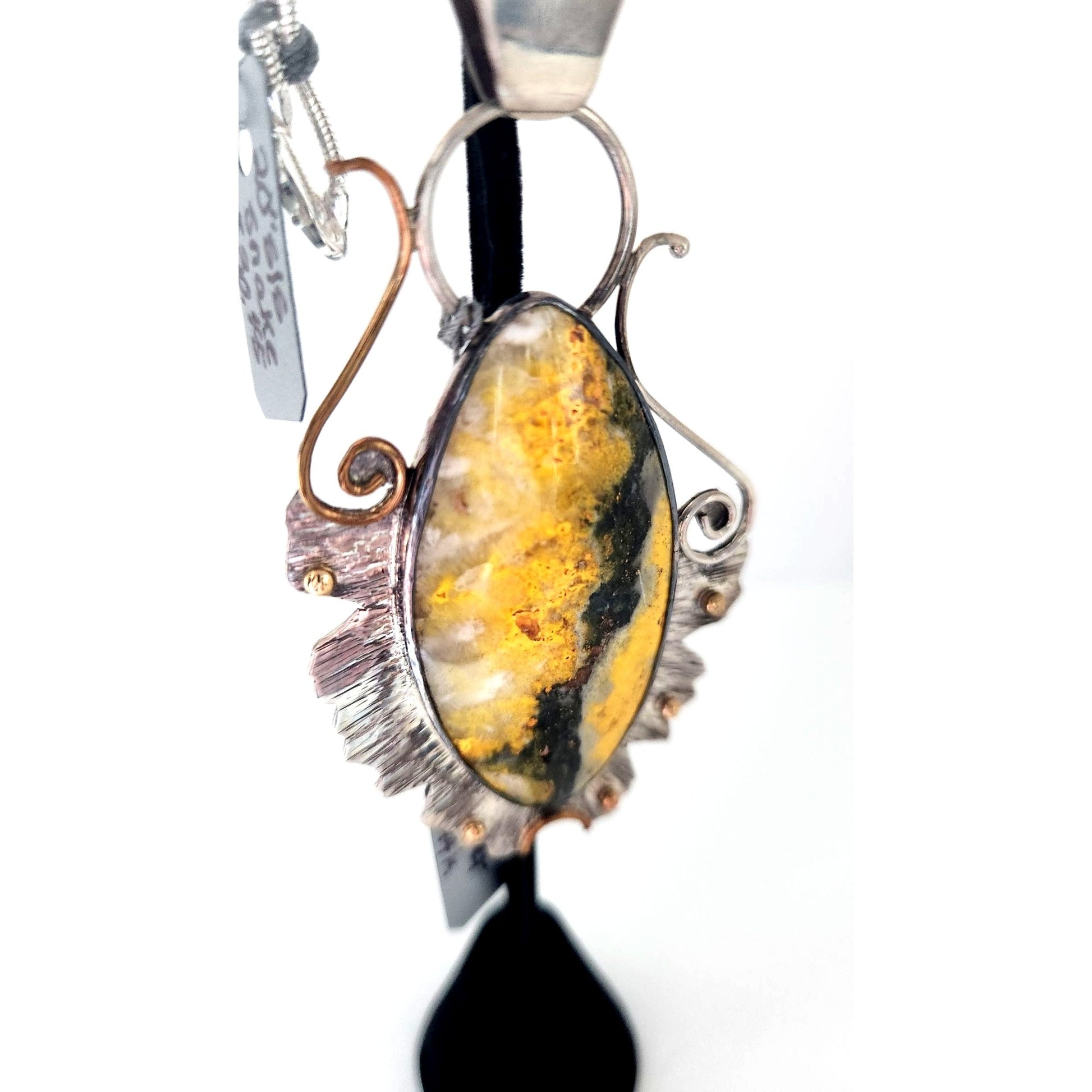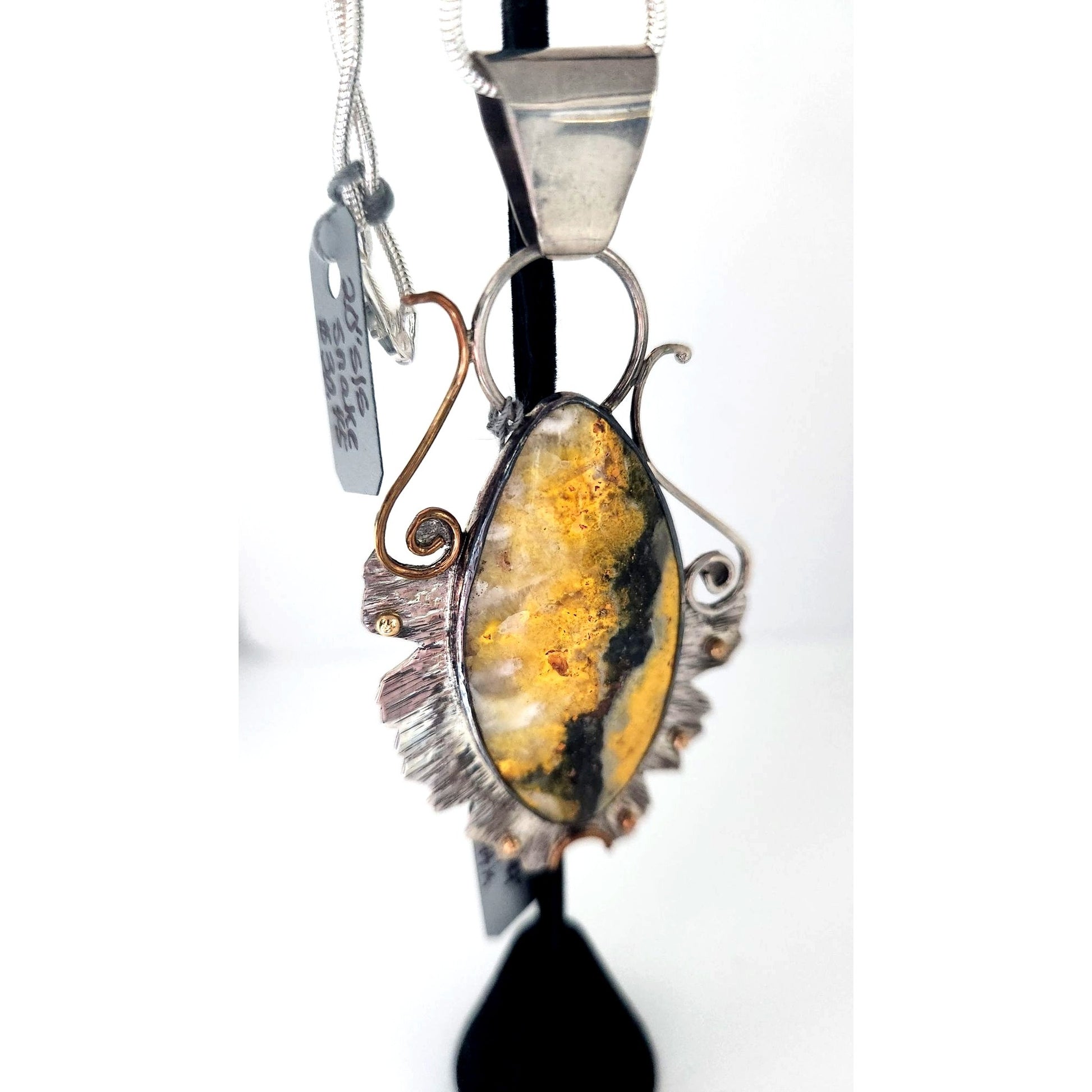 Elegant Bumble Bee Jasper pendant features a striking stone framed in 925 silver with 14K gold accents, perfect for any jewelry collection.