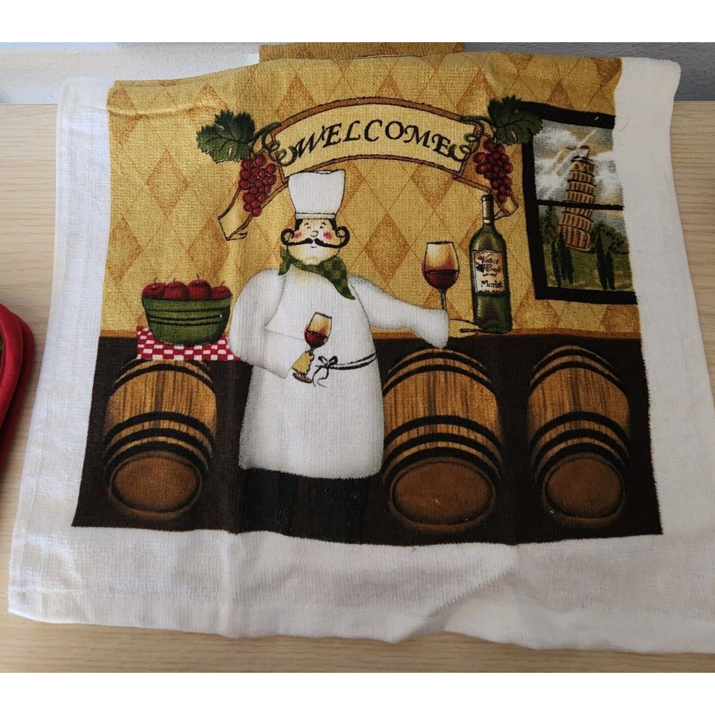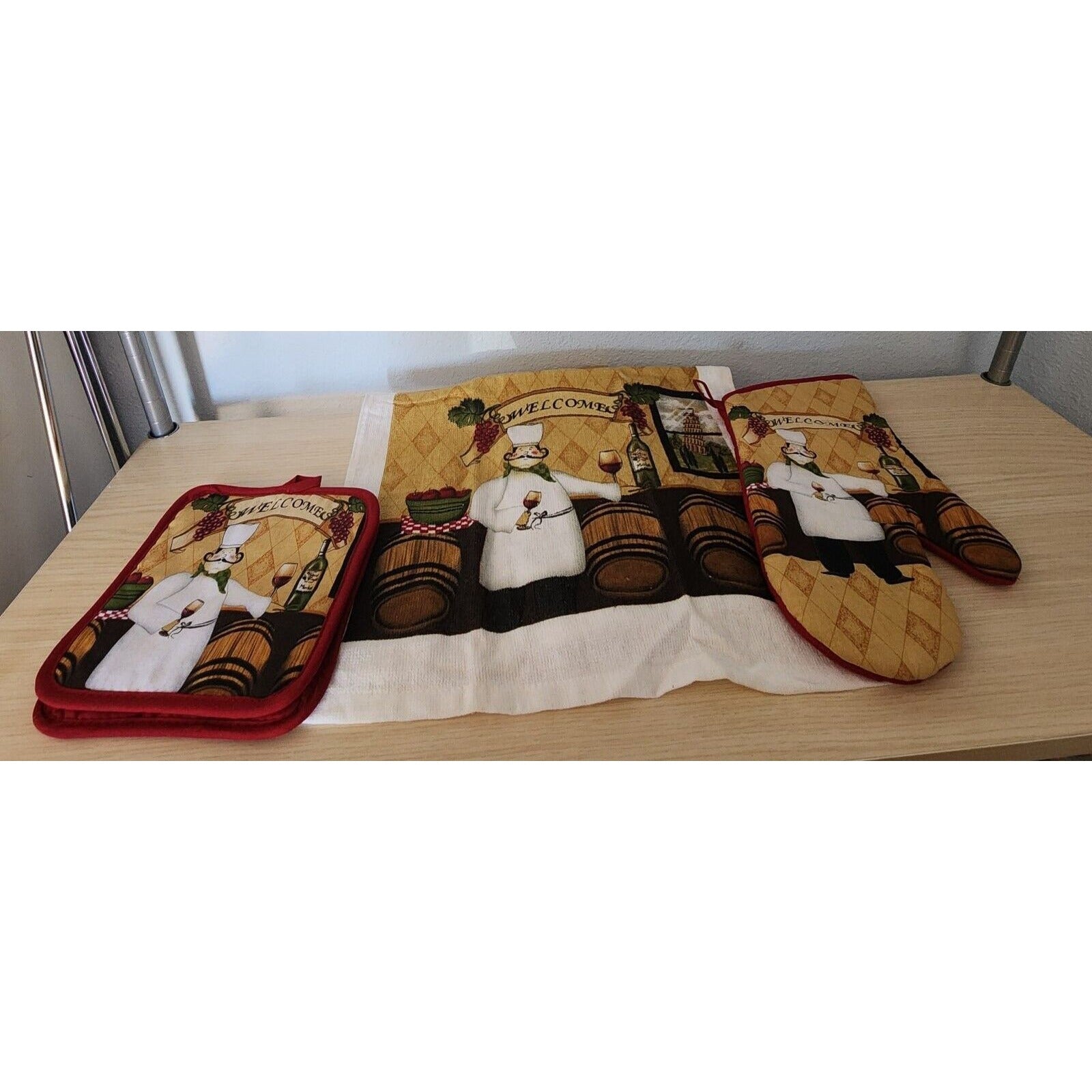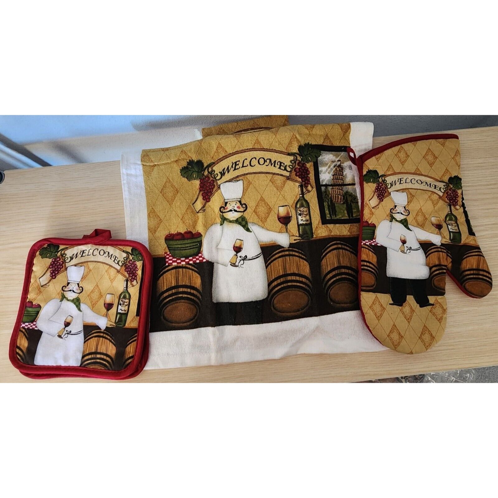 Kitchen Towel 5 Piece Set Welcome Chef 2 Towels 2 Pot Holders, 1 Oven Mitt