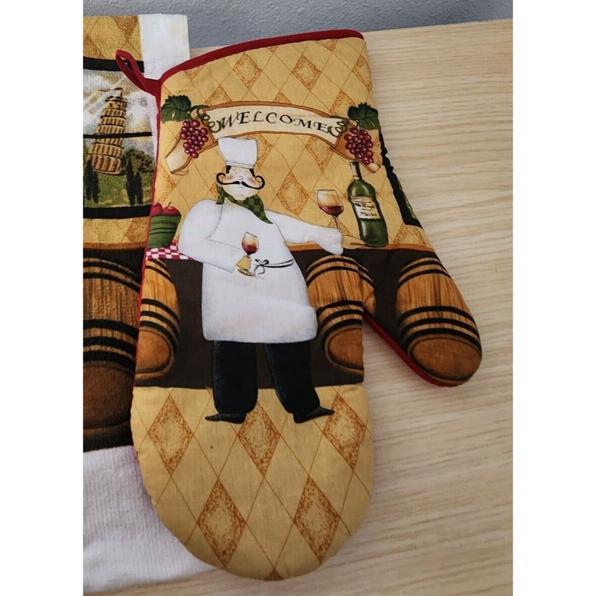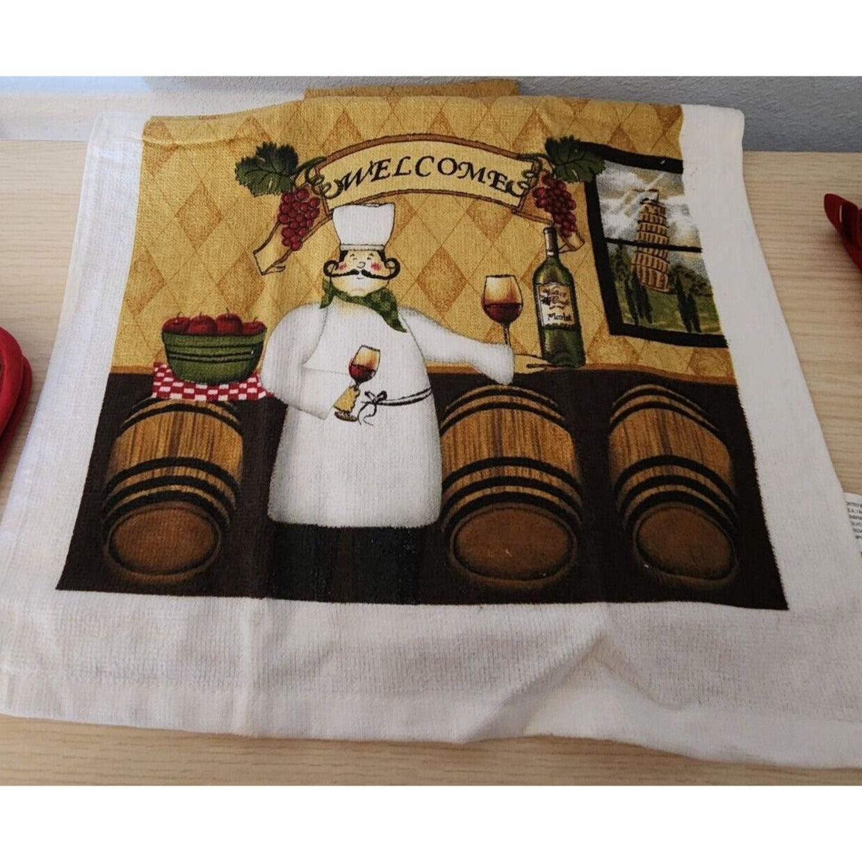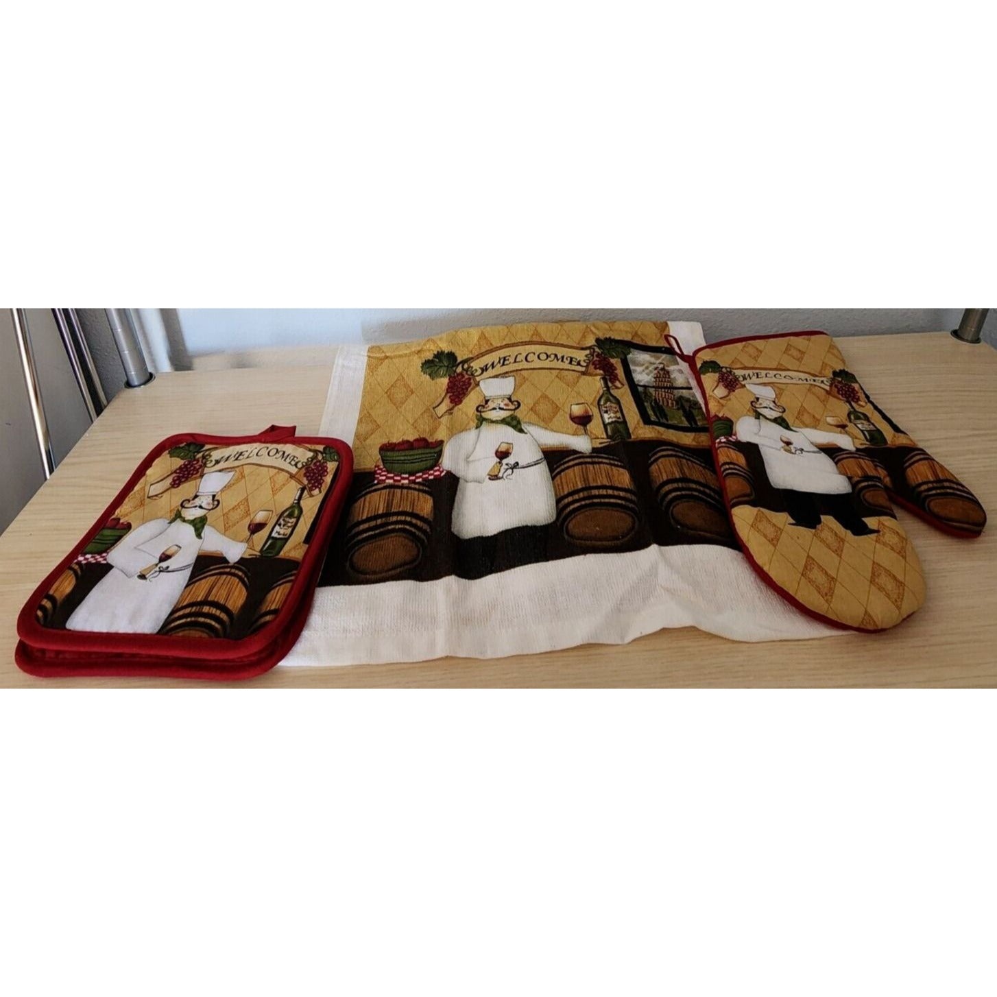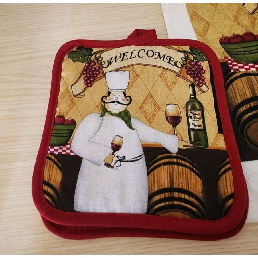 Kitchen Towel 5 Piece Set Welcome Chef 2 Towels 2 Pot Holders, 1 Oven Mitt