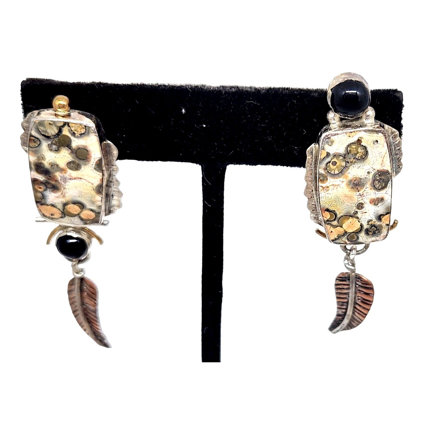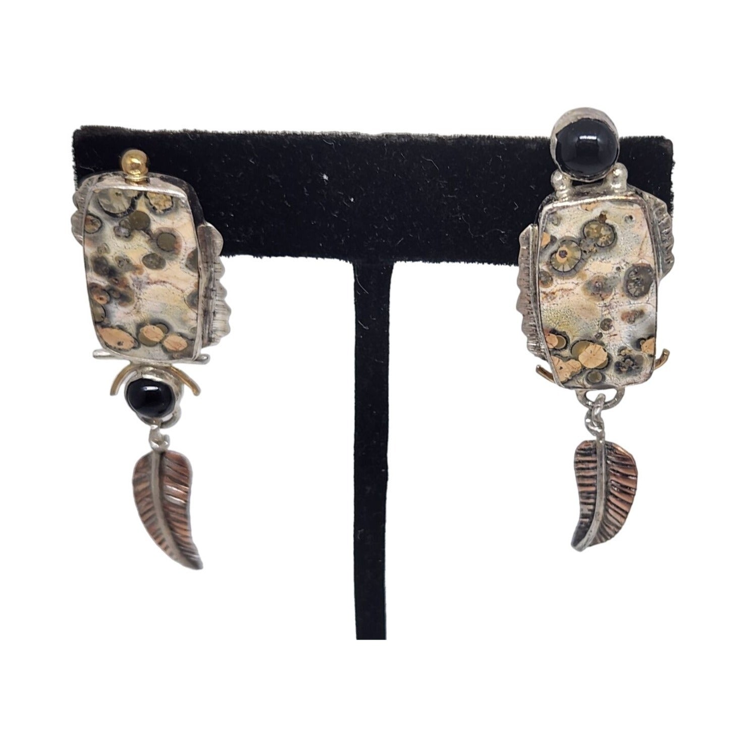 Leopard Jasper Earrings Copper Feather Black Onyx 8mm Circle 11.6 Gr Silver Post