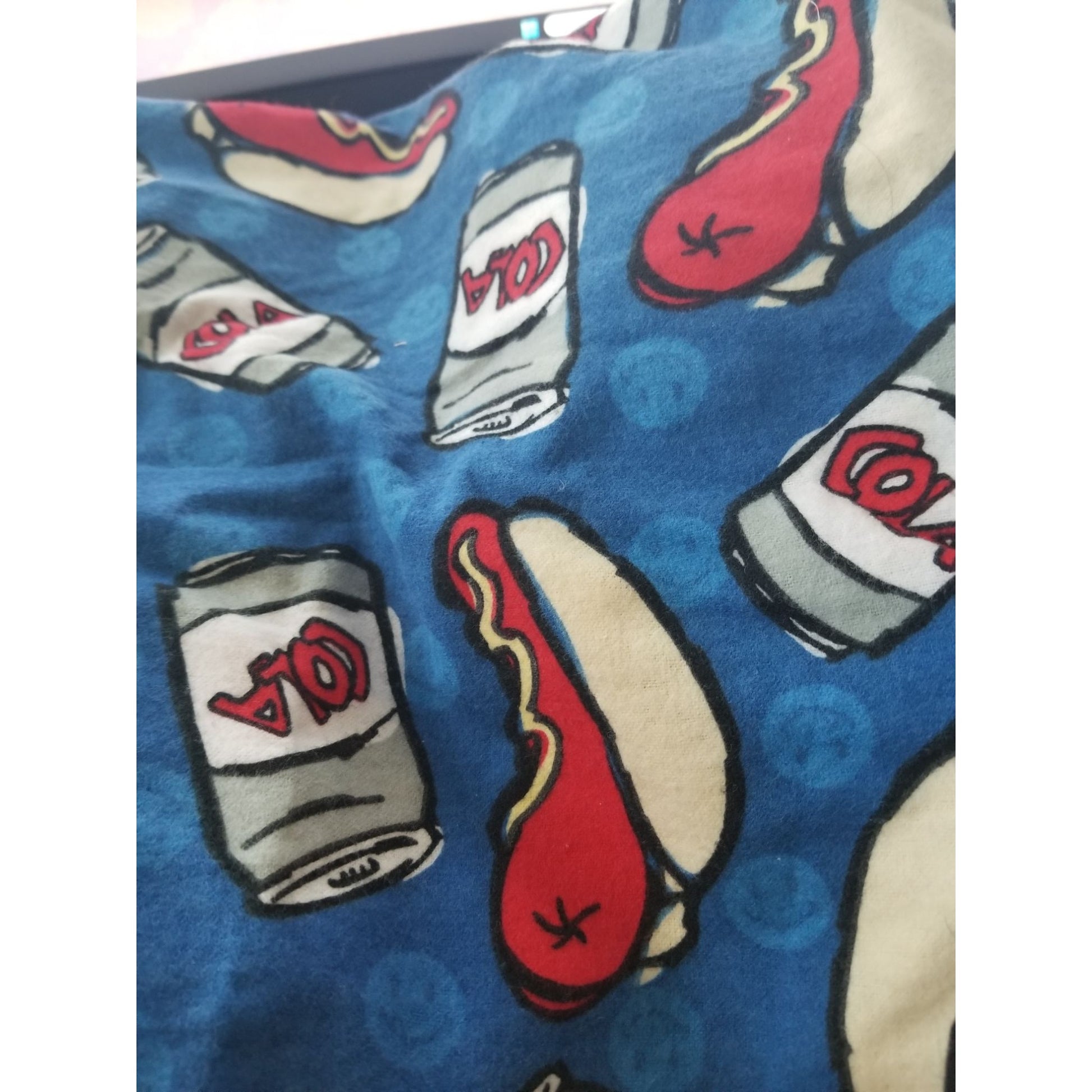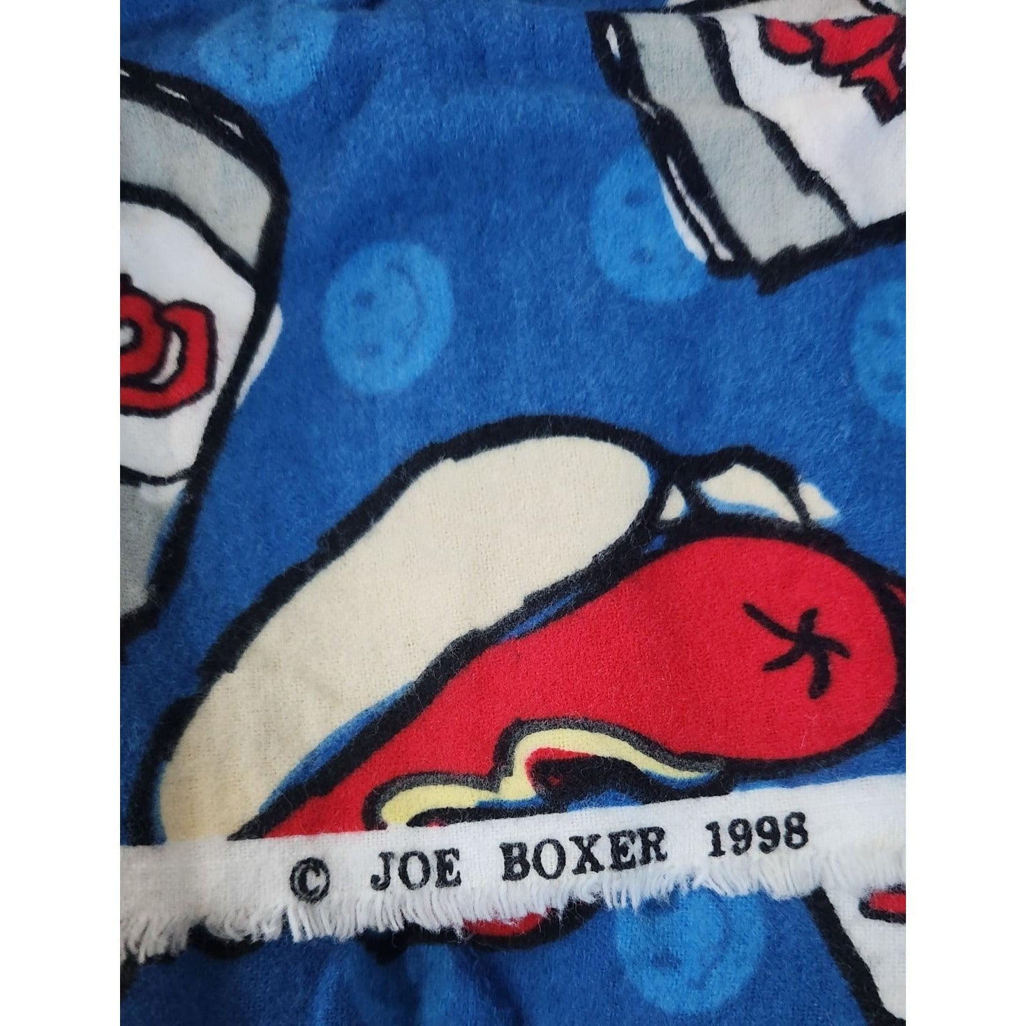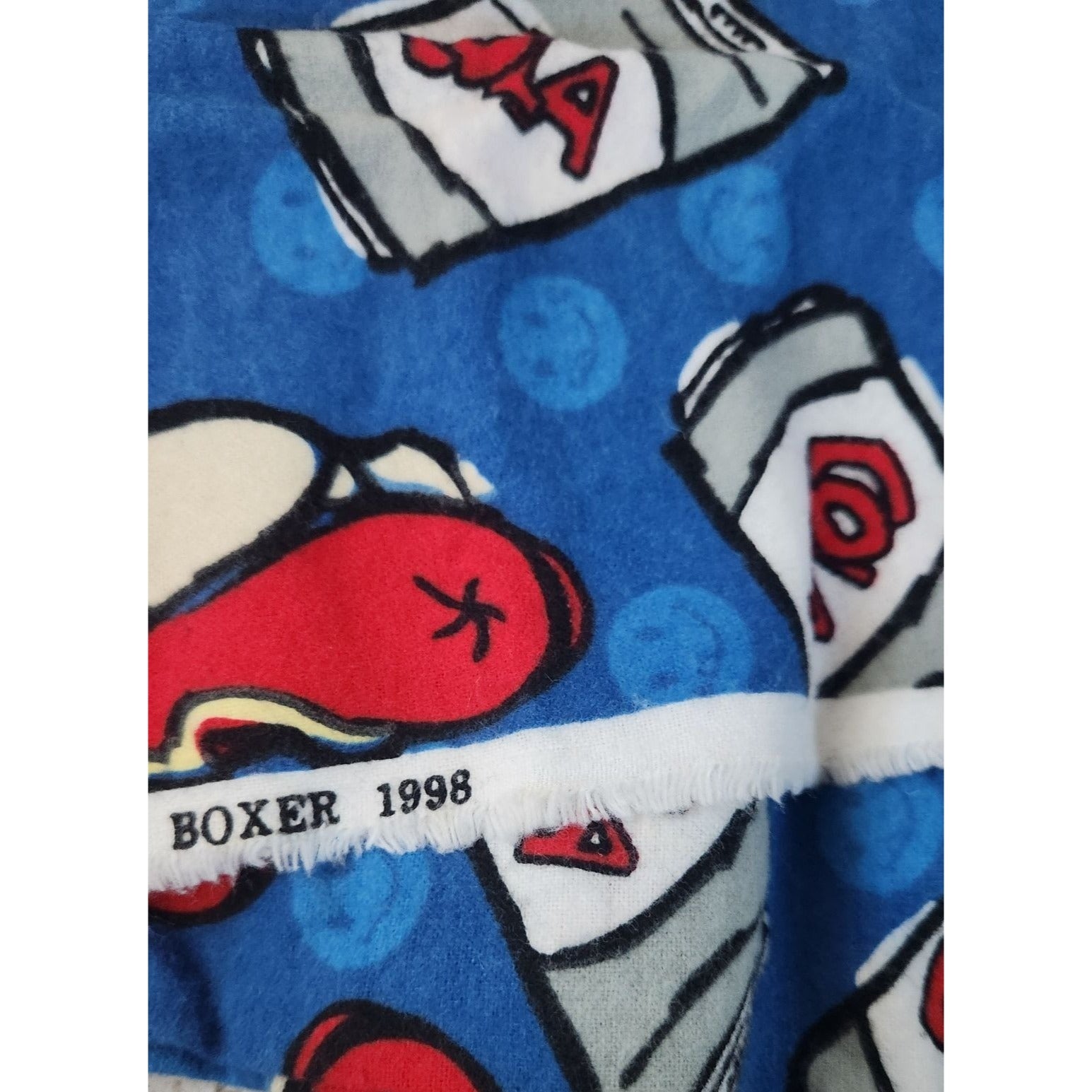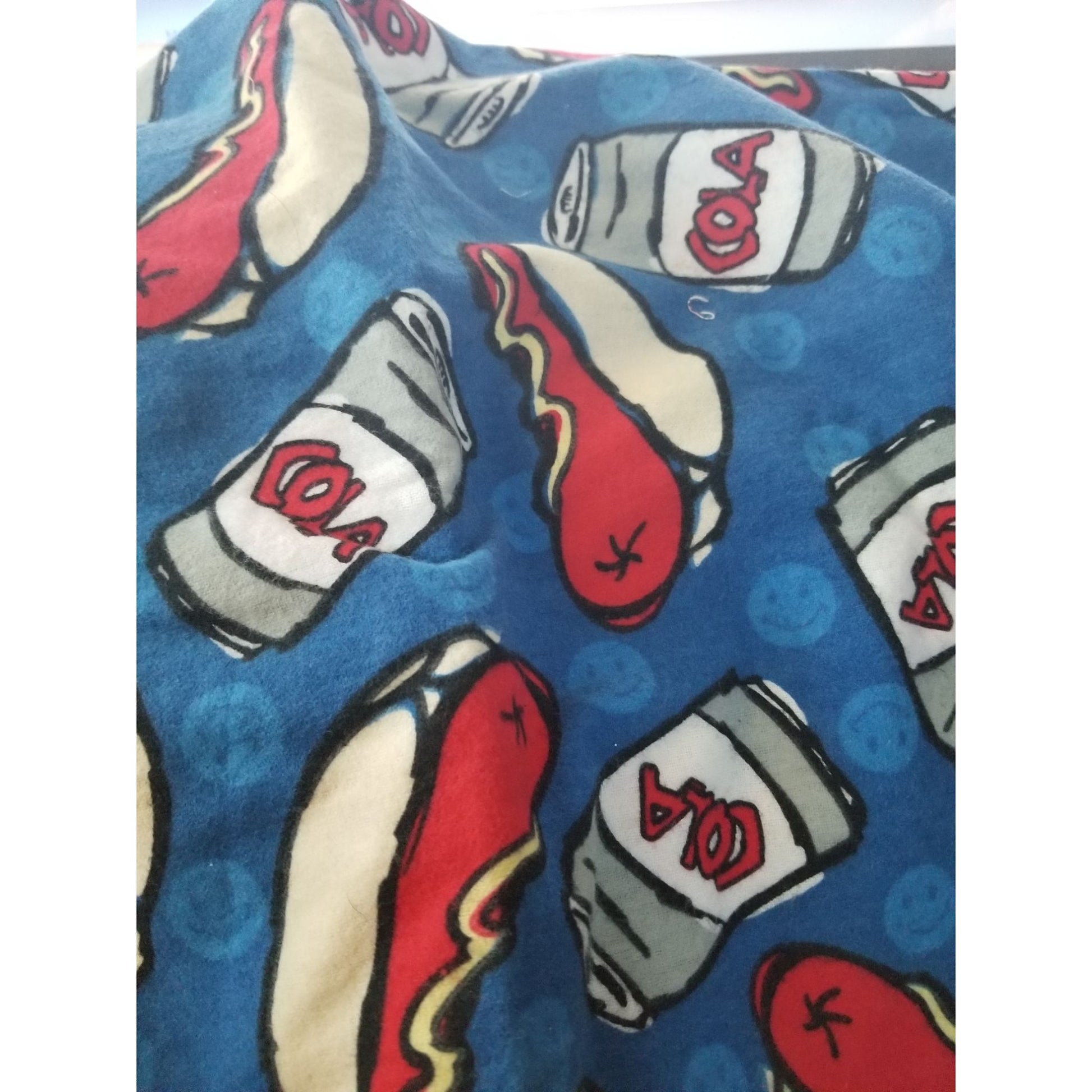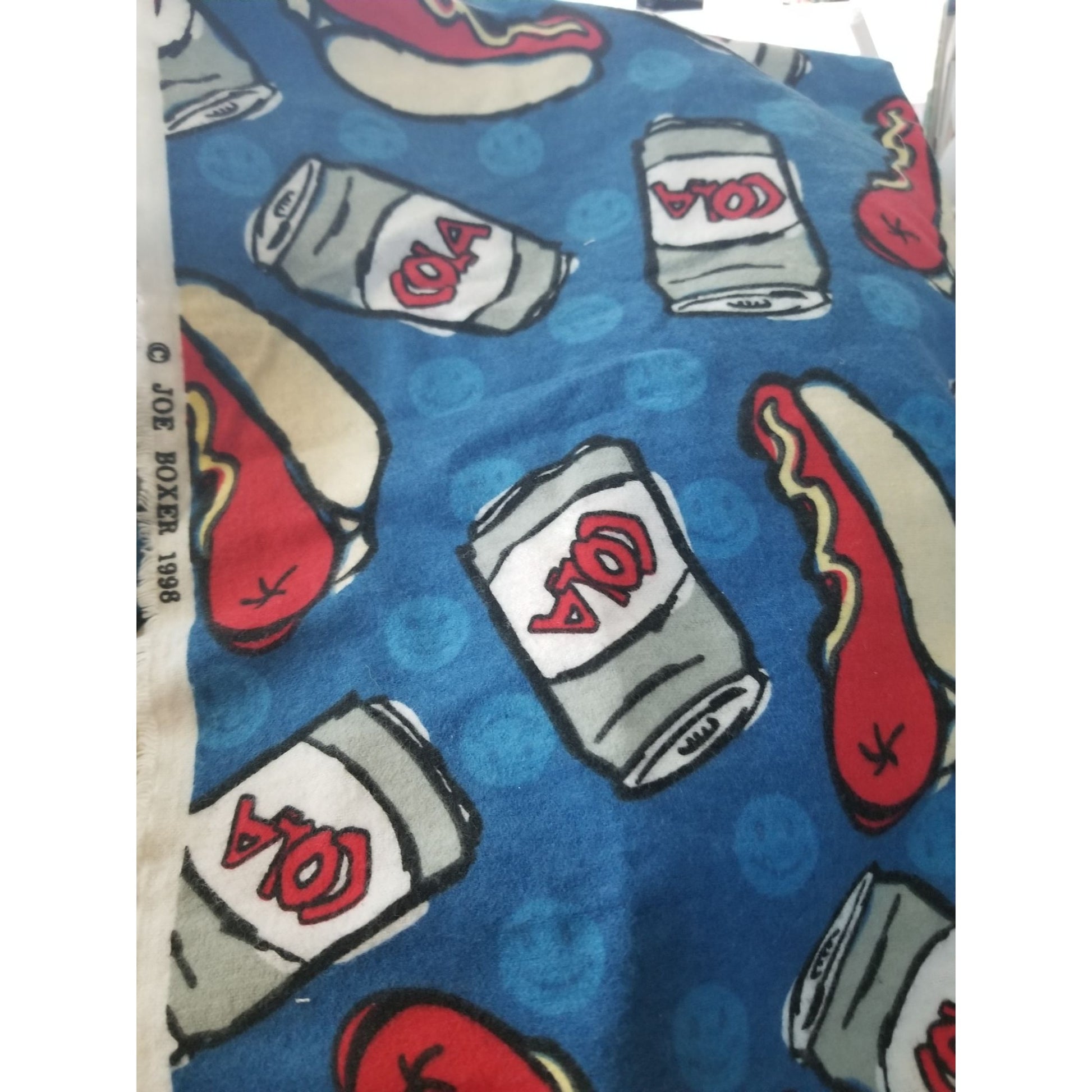 This 1998 Joe Boxer Material Blue Flannel features a vibrant hot dogs and cola design, perfect for craft and quilting projects. The lightweight fabric measures 22 x 22 inches.
