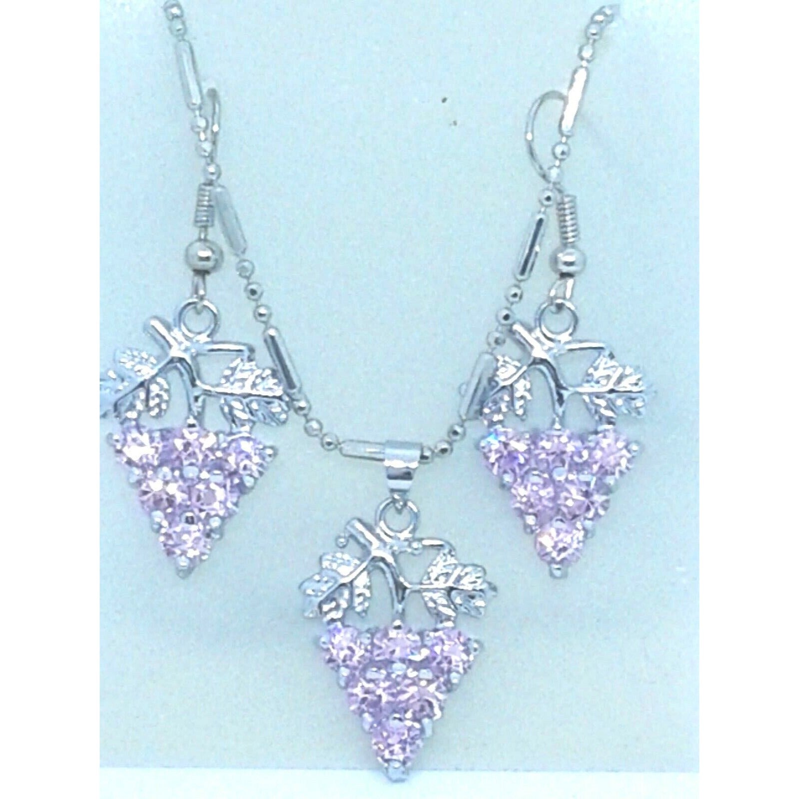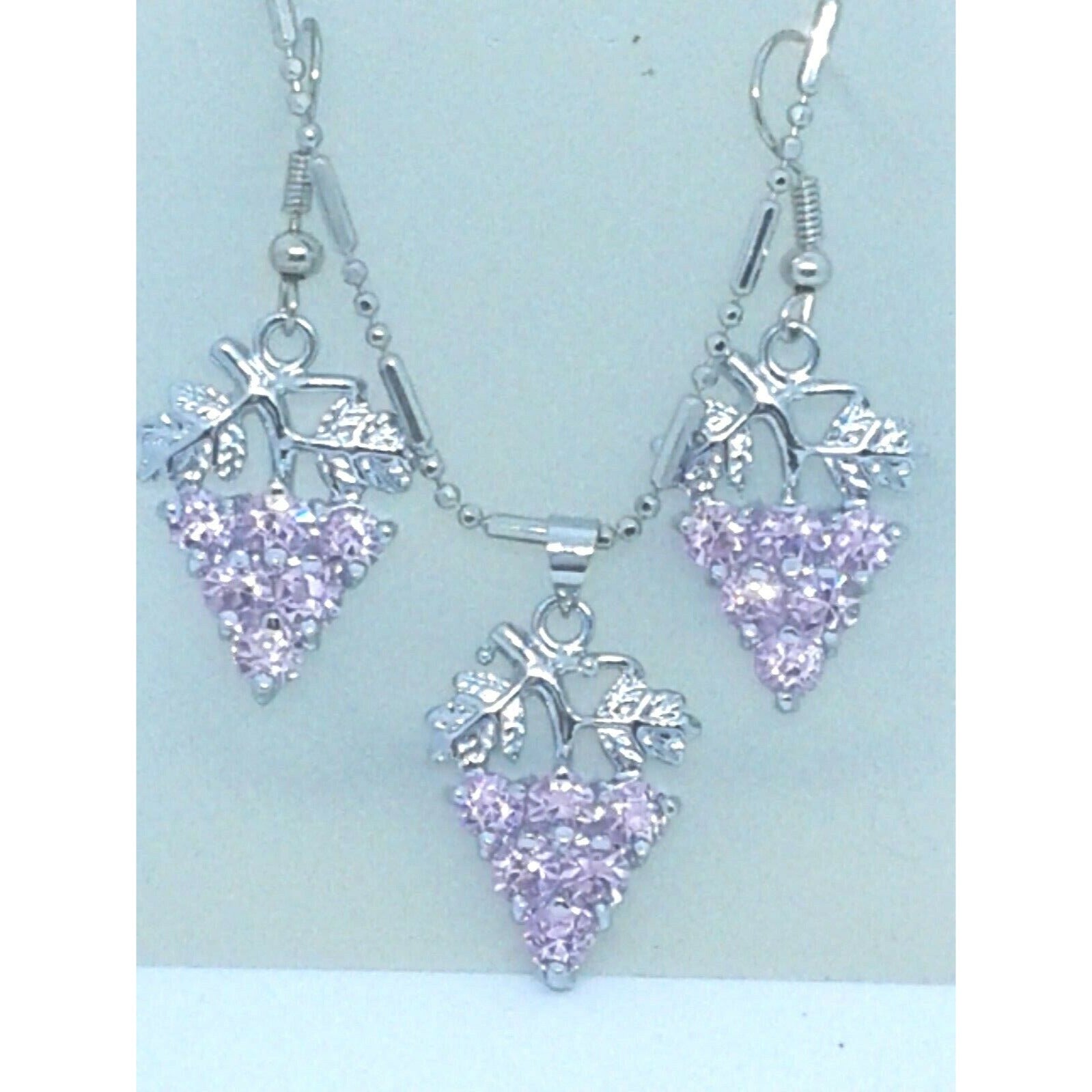 Necklace Earrings Set Pink Crystal Grape Cluster Leaves Vines 1" Long Silver Chain Sterling Hooks