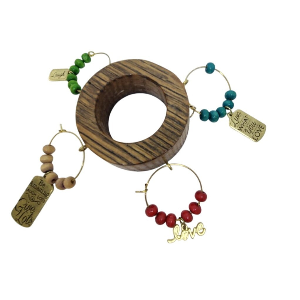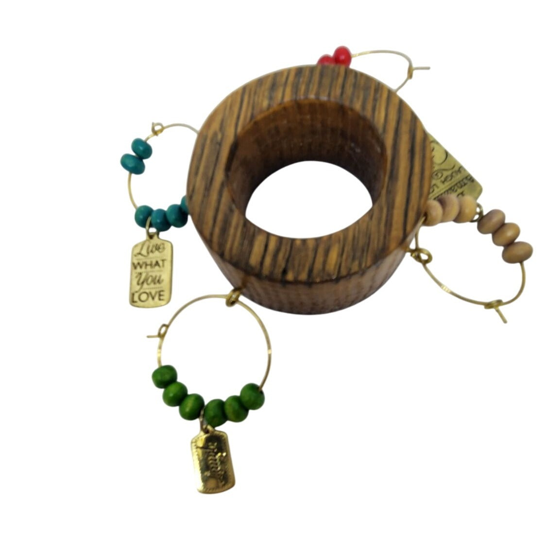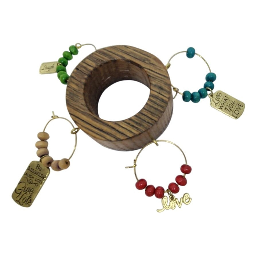 Rustic Wooden Wine Glass Charms Set Of 4 With Beaded Rings & Inspirational Tags