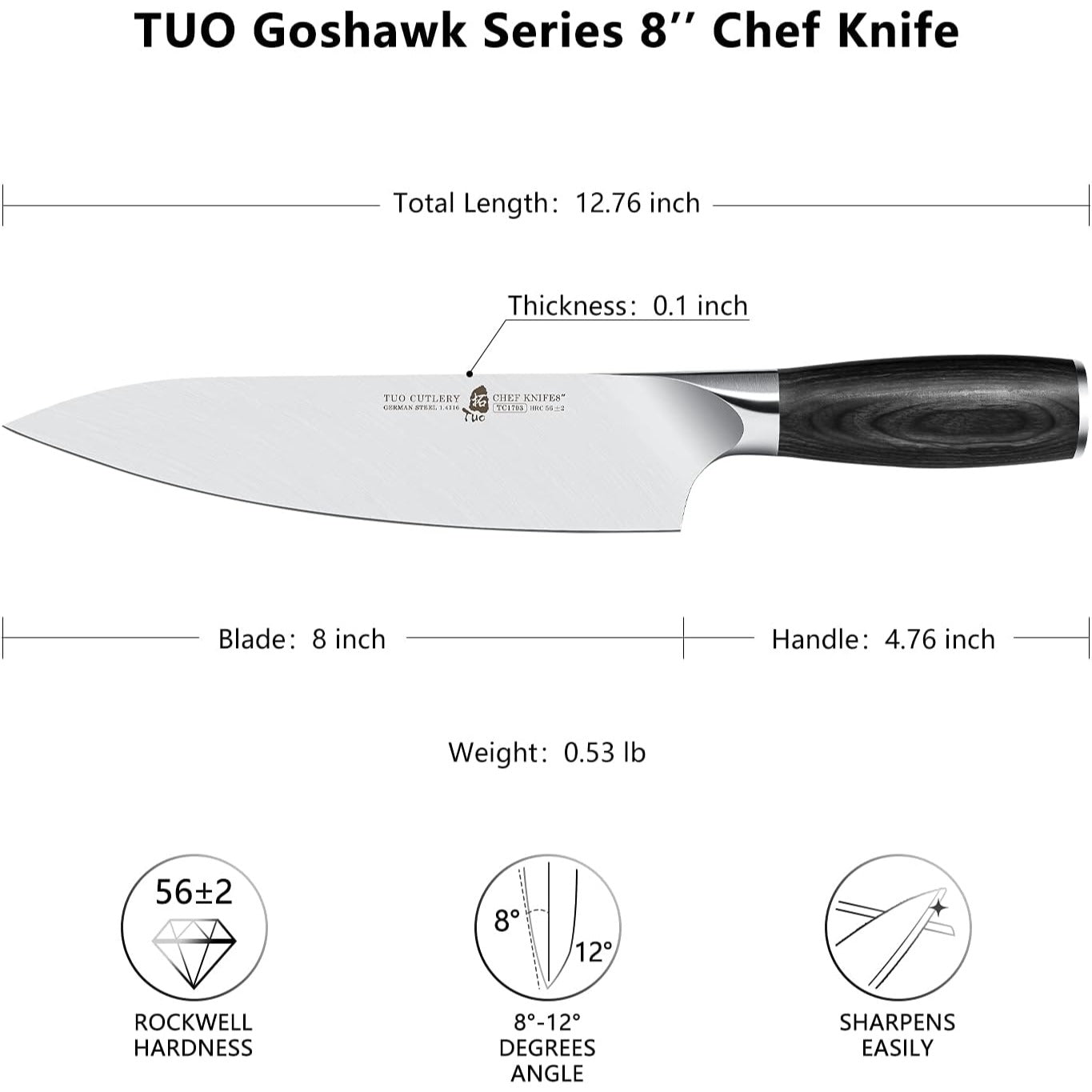 TUO Chef Knife 8", Pro Chefs Cooking Knife Japanese Vegetable Cleaver, High Carbon German Stainless Steel, Ergonomic Pakkawood Handle, Goshawk Series