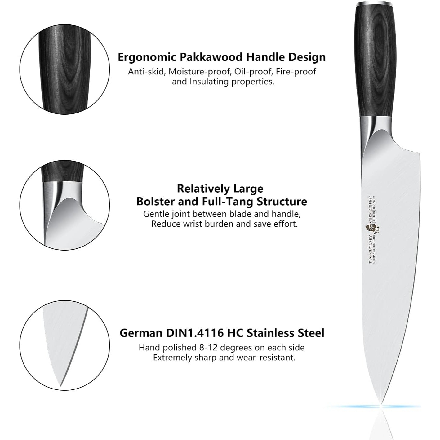 ⛄【ELEGANT AND PRACTICAL HANDLE DESIGN】: The ergonomic pakkawood handle has excellent anti-skid, moisture-proof, oil-proof, fire-proof and insulating properties. The round handle is suitable for people with relatively large hands. The slope of the joint between the blade and the handle is gentle, which can reduce your wrist burden and save effort to the greatest extent. The excellent weight distribution of the cooking knife allows you to use it for a long time without fatigue.