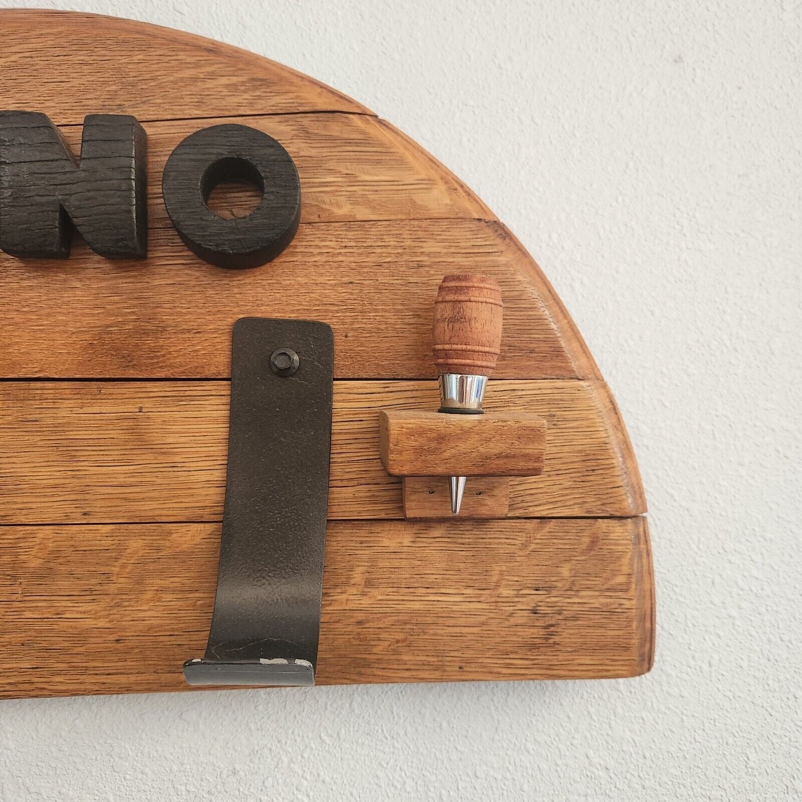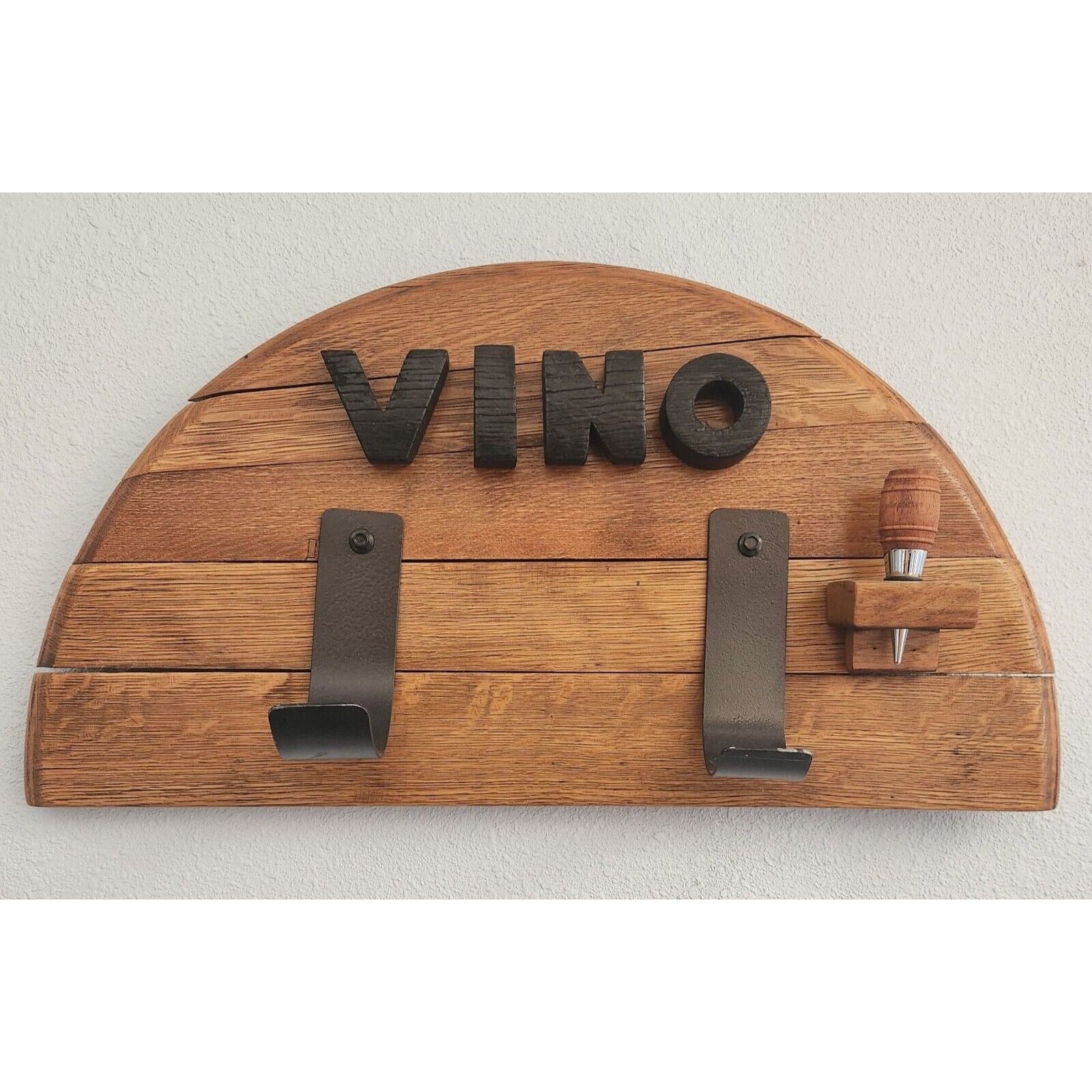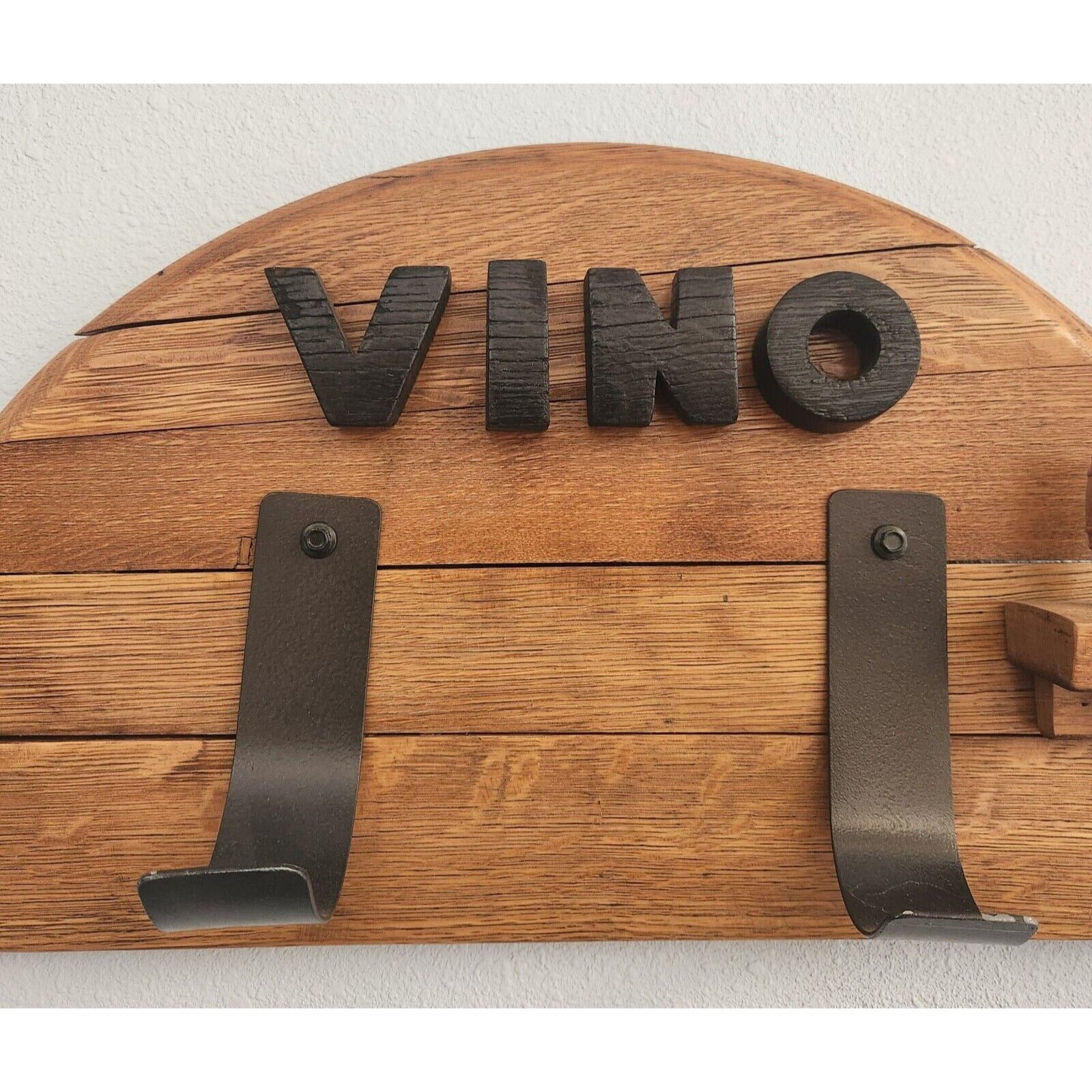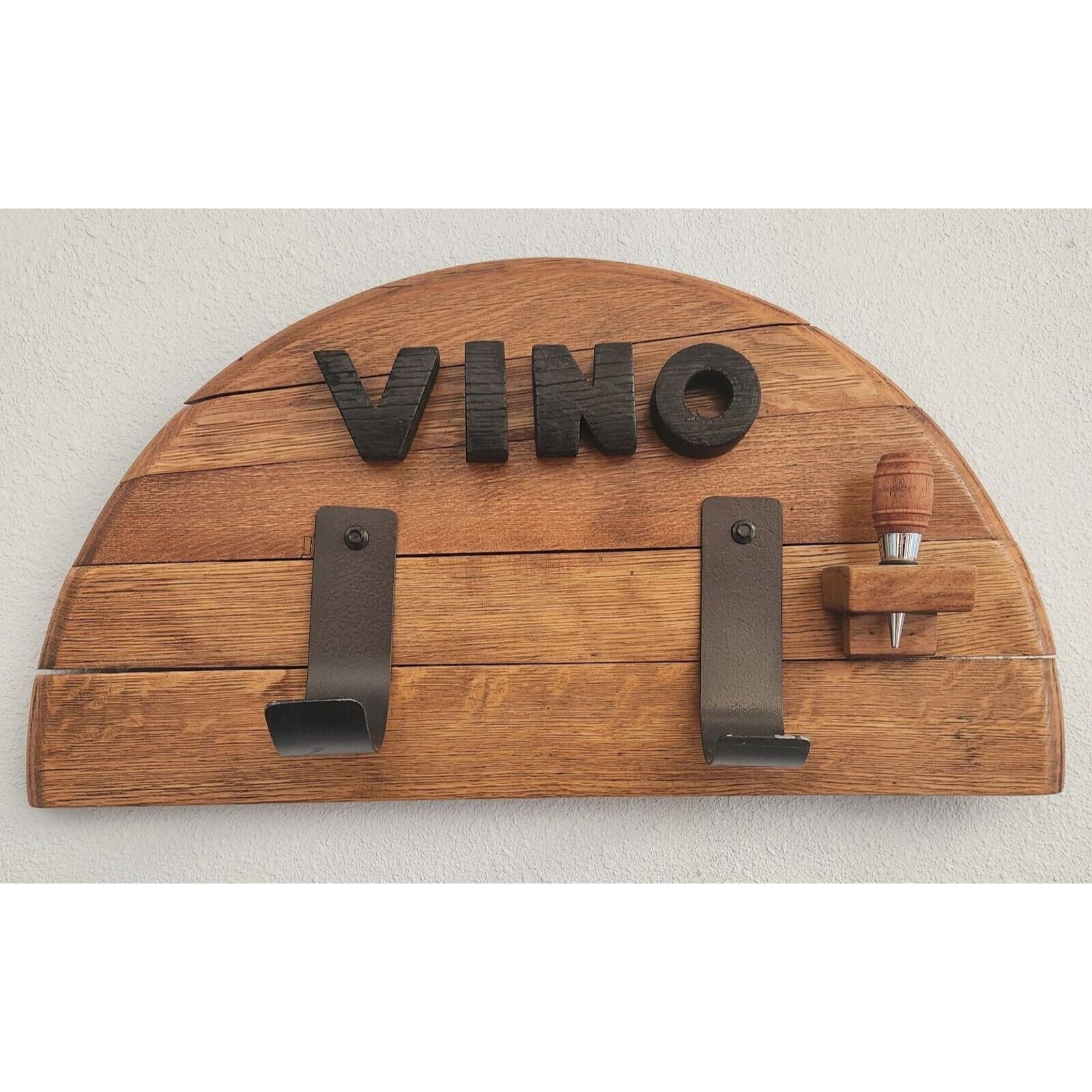 Wine Bottle Holder Says " Vino" with a Bottle Stopper Made from Barrel Stave Ring