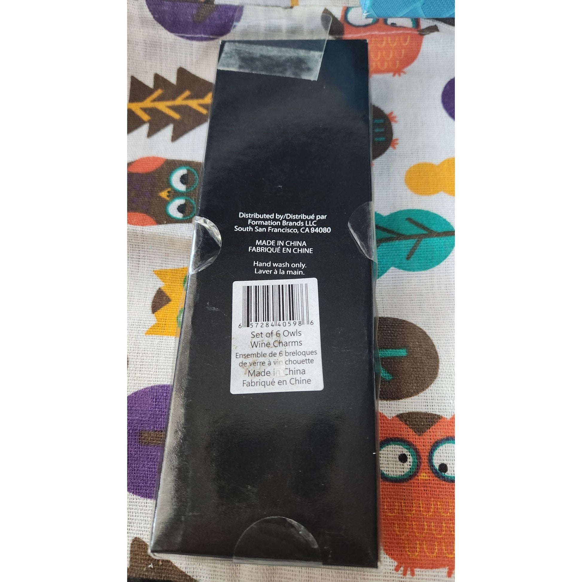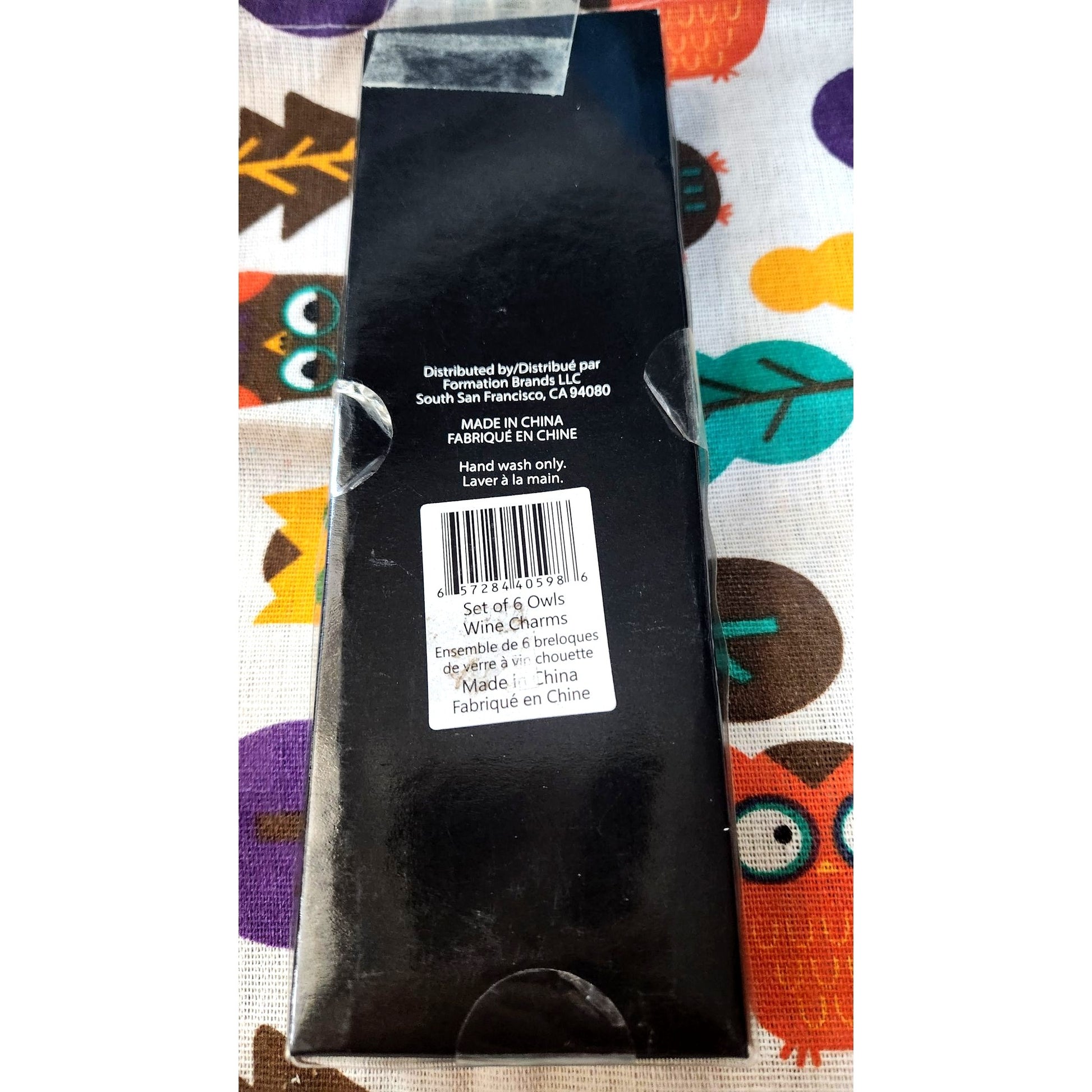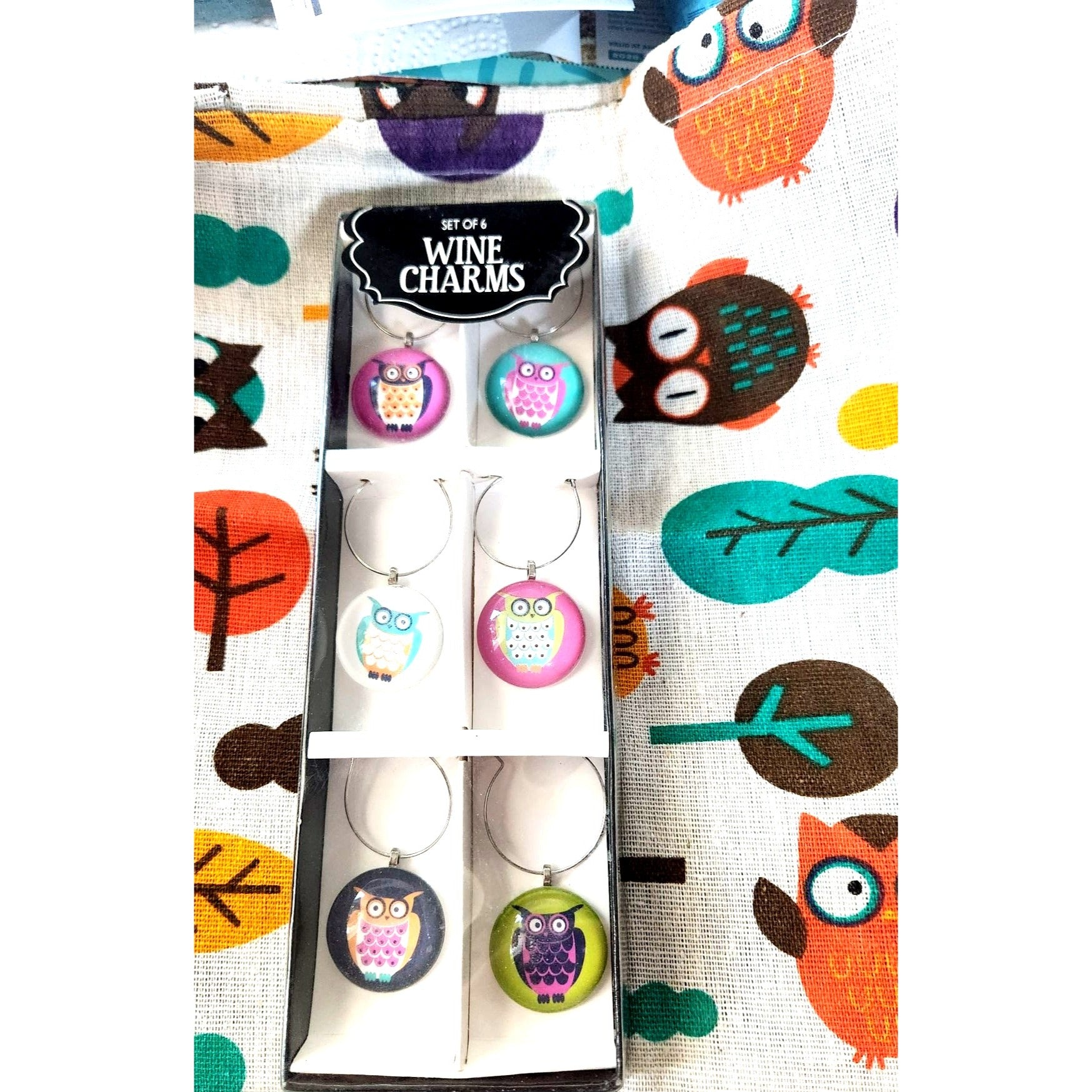 Wine charms Owl's Set of 6 in green, black, pink, and white. Comes with a 10 x 9 1/2 drawstring reusable bag featuring an owl design.