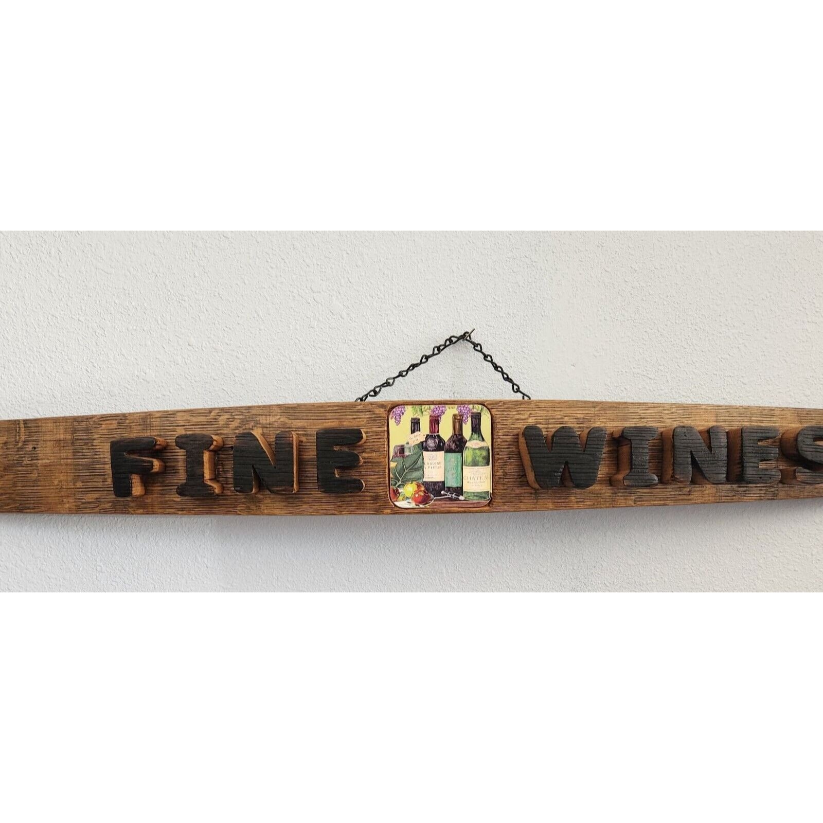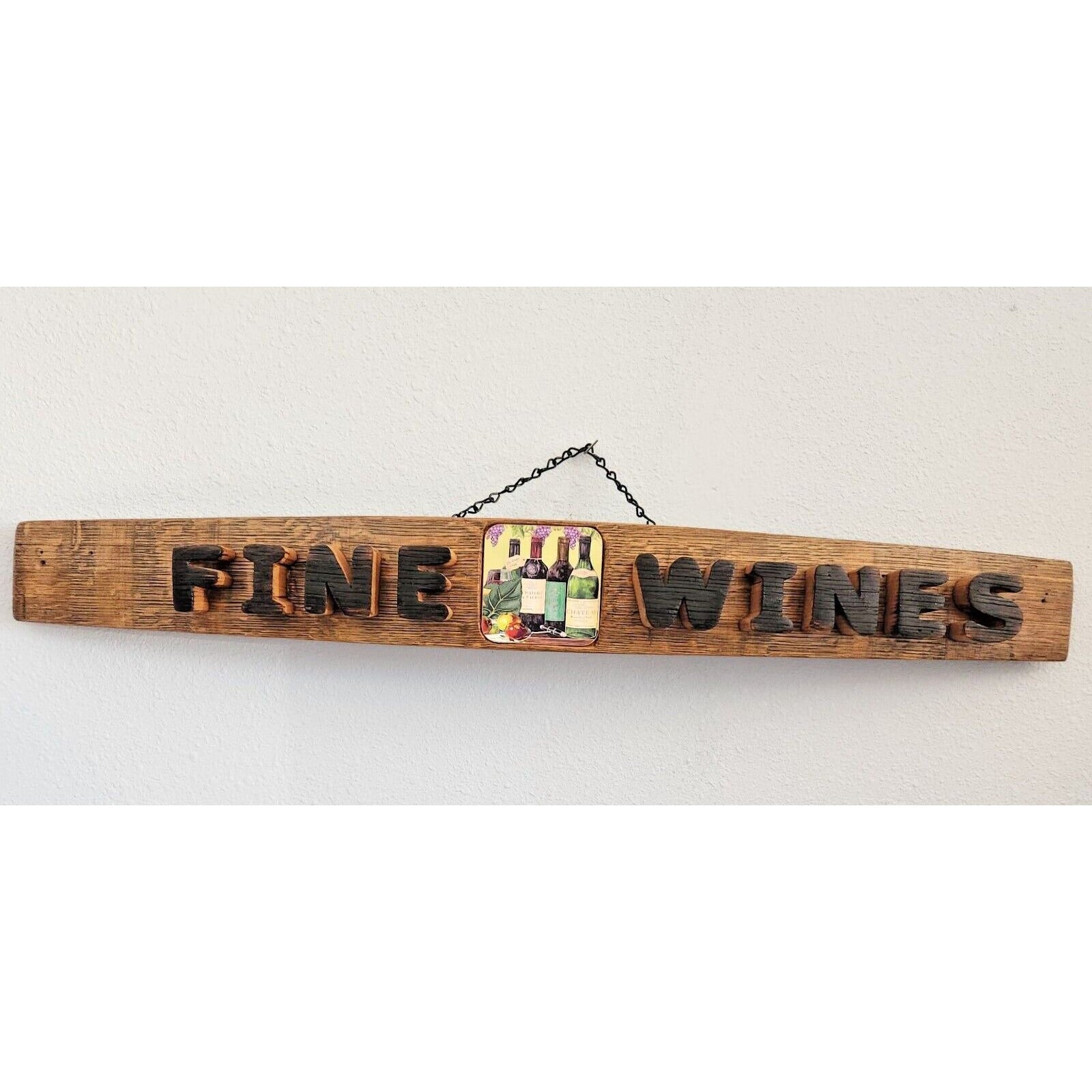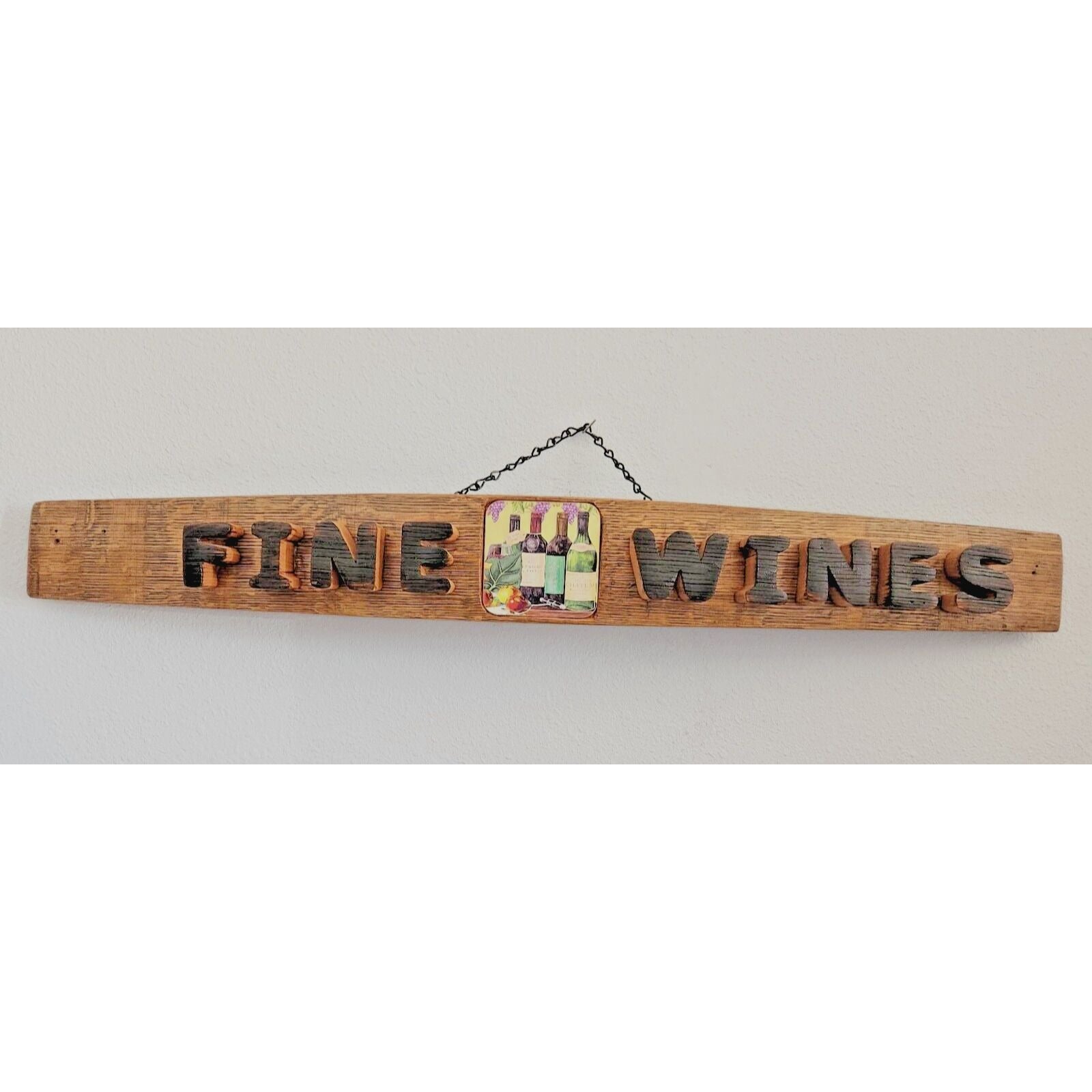 Wood Sign Wine Stave says "Fine Wines" Tile in the Middle Letters Cut Stave