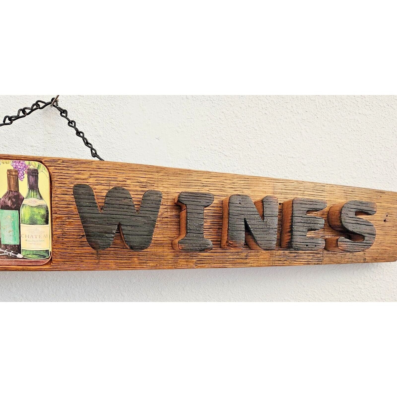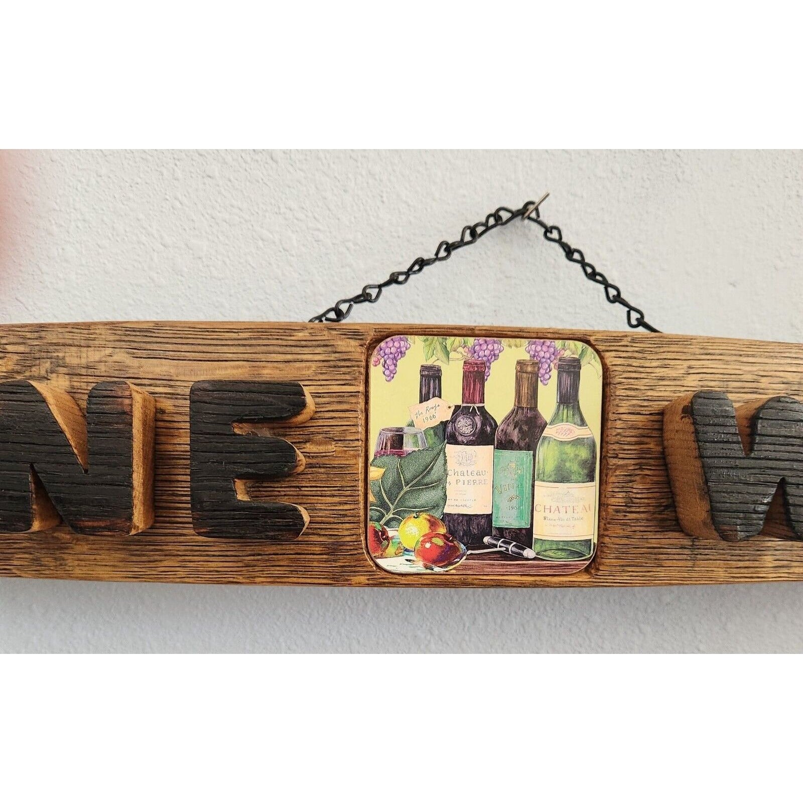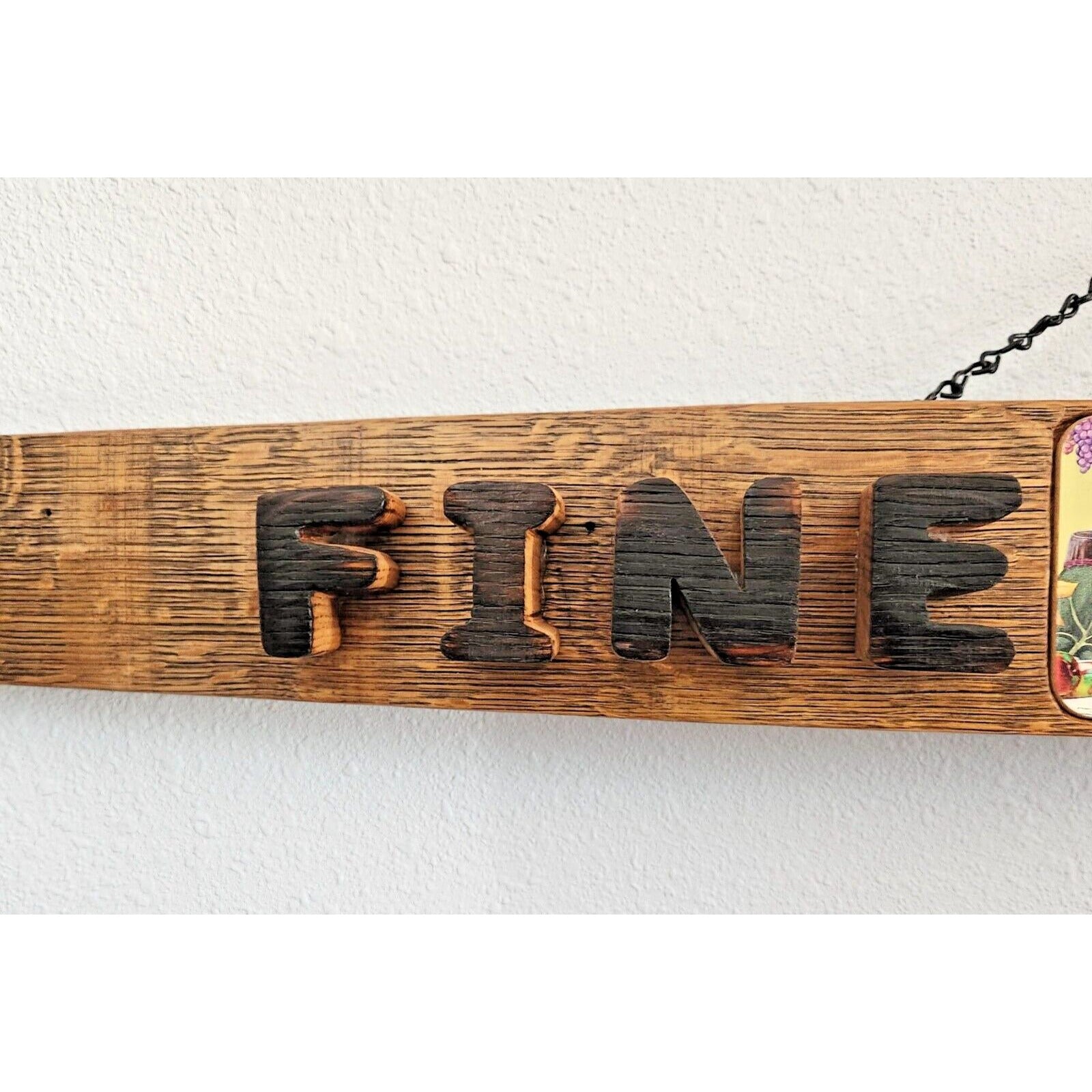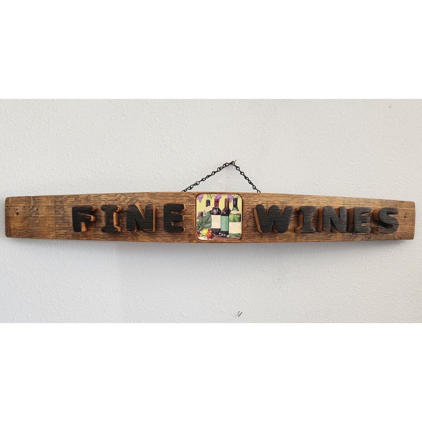 Wood Sign Wine Stave says "Fine Wines" Tile in the Middle Letters Cut Stave